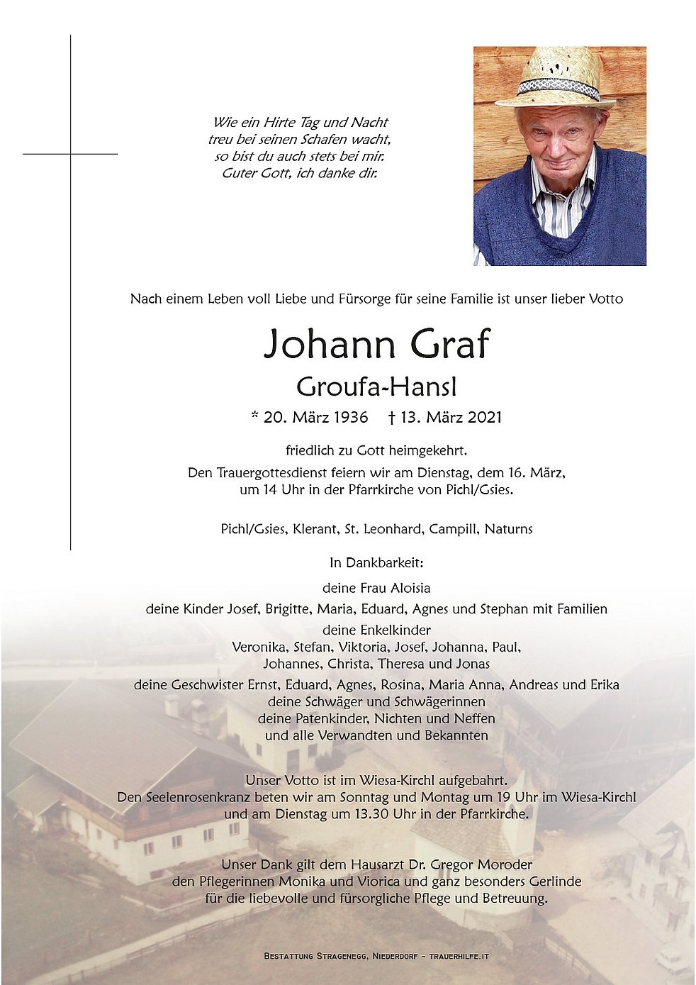 Den Trauergottesdienst feiern wir am Dienstag, dem 16. März, um 14 Uhr in der Pfarrkirche von Pichl/Gsies.