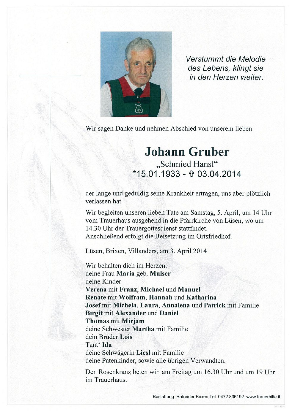 Wir begleiten unseren lieben Tate am Samstag, 5. April, um 14 Uhr vom Trauerhaus ausgehend in die Pfarrkirche von Lüsen, wo um 14.30 Uhr der Trauergottesdienst stattfindet.