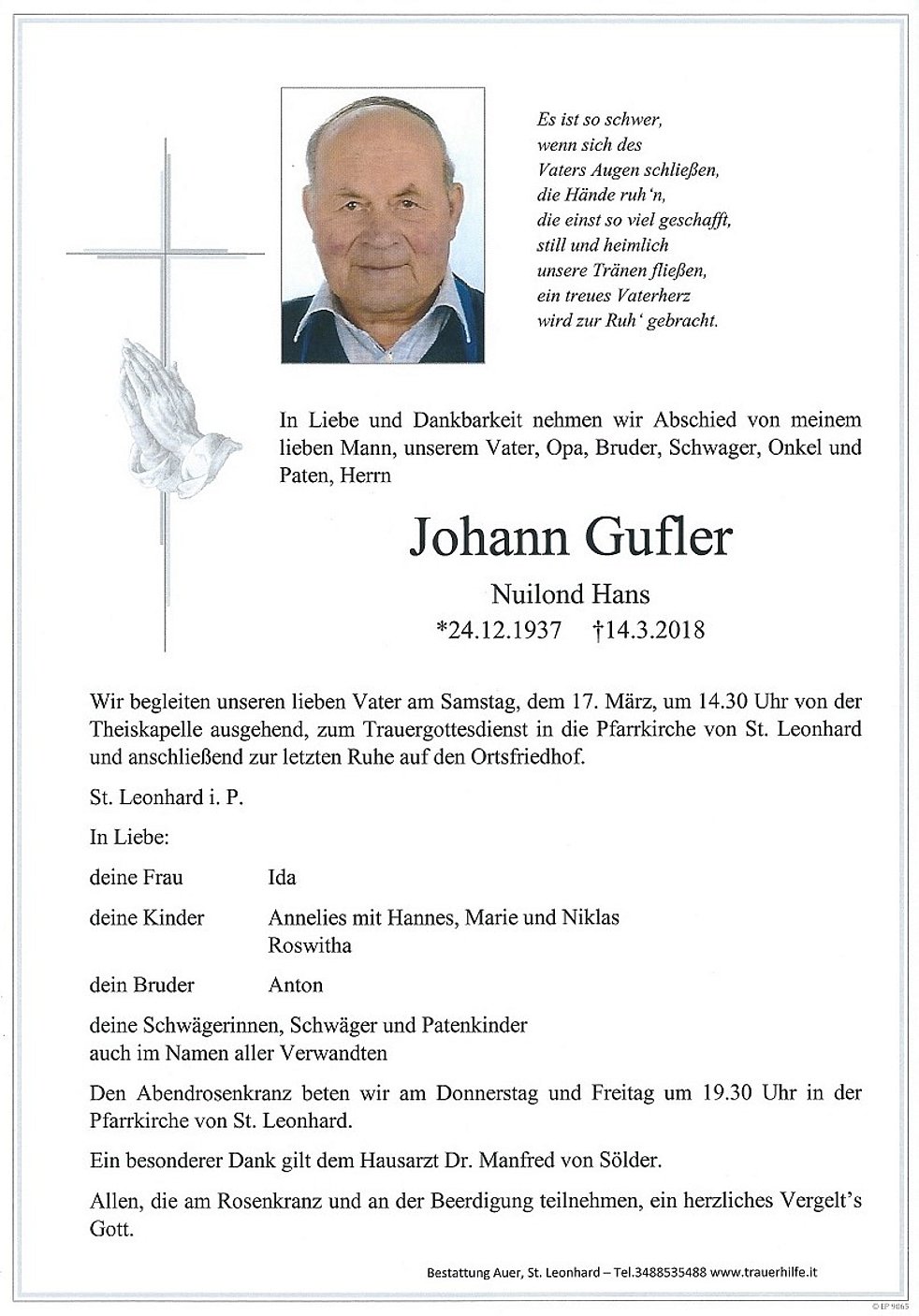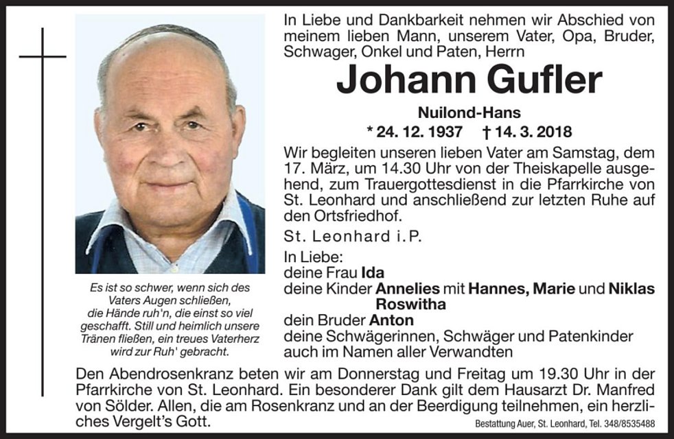 Wir begleiten unseren lieben Vater am Samstag, dem 17. März, um 14.30 Uhr von der Theiskapelle ausgehend, zum Trauergottesdienst in die Pfarrkirche von St. Leonhard und anschließend zur letzten Ruhe auf den Ortsfriedhof.