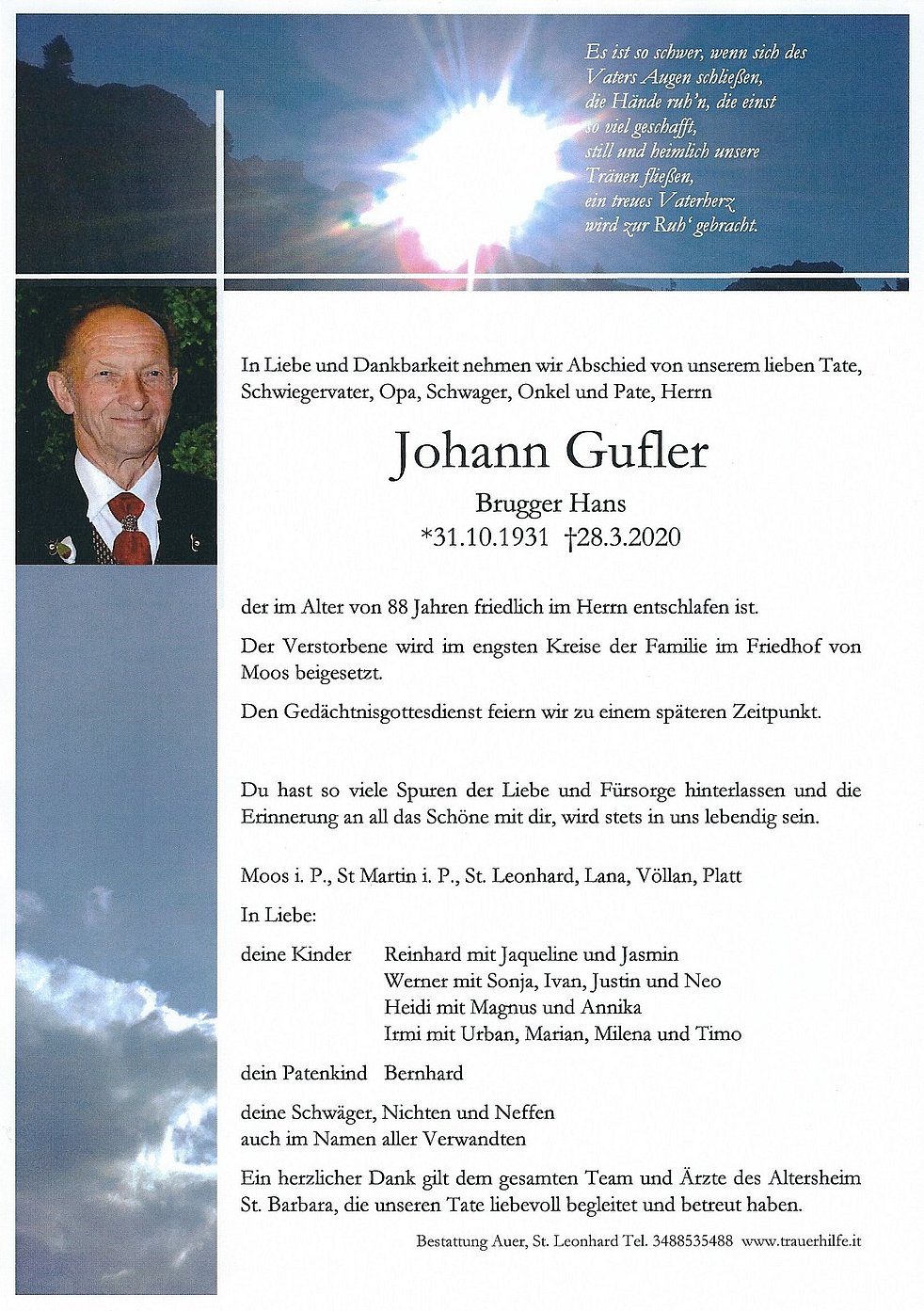Der Verstorbene wird im engsten Kreise der Familie im Friedhof von Moos beigesetzt.