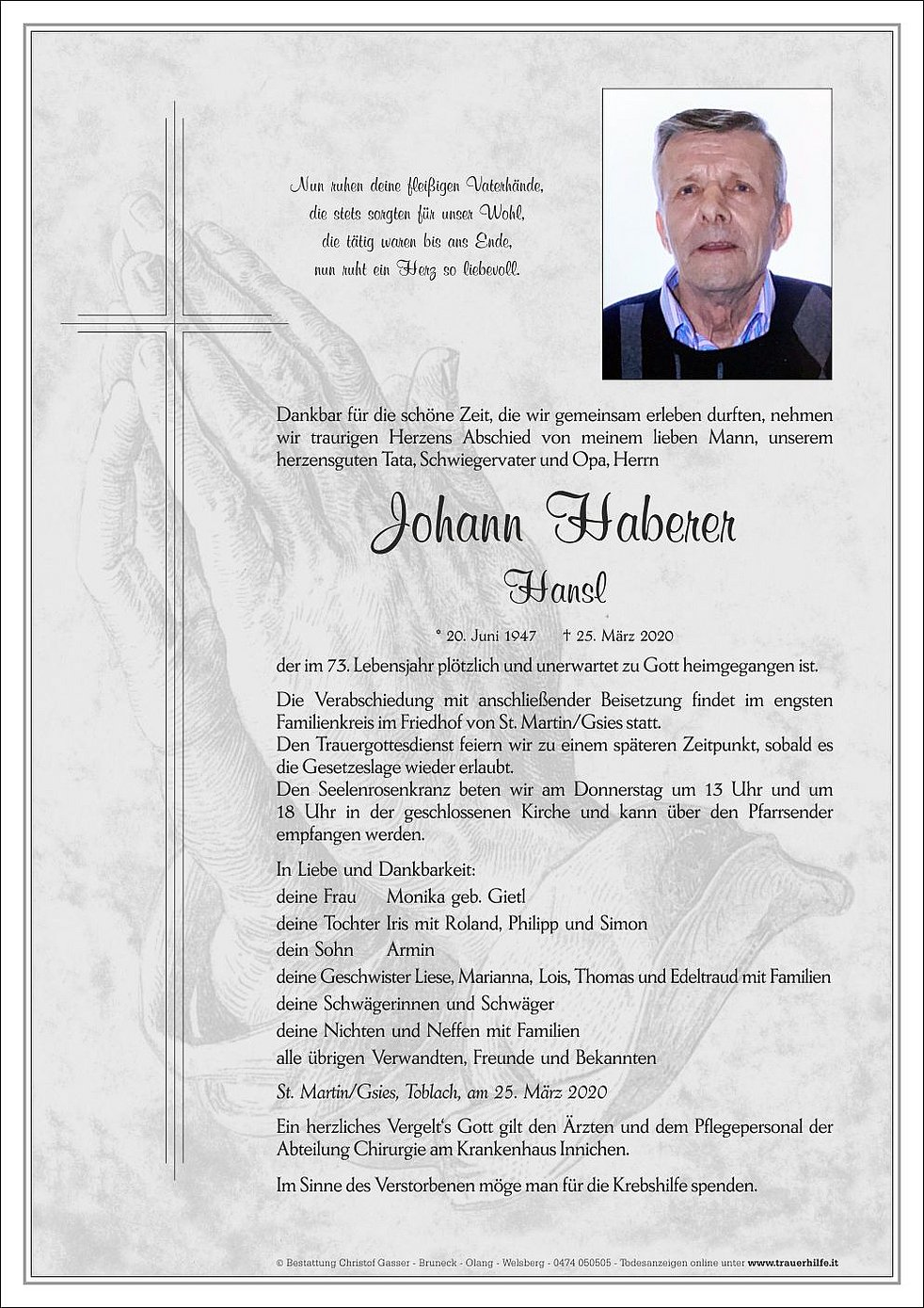 Die Verabschiedung mit anschließender Beisetzung findet im engsten Familienkreis im Friedhof von St. Martin/Gsies statt.