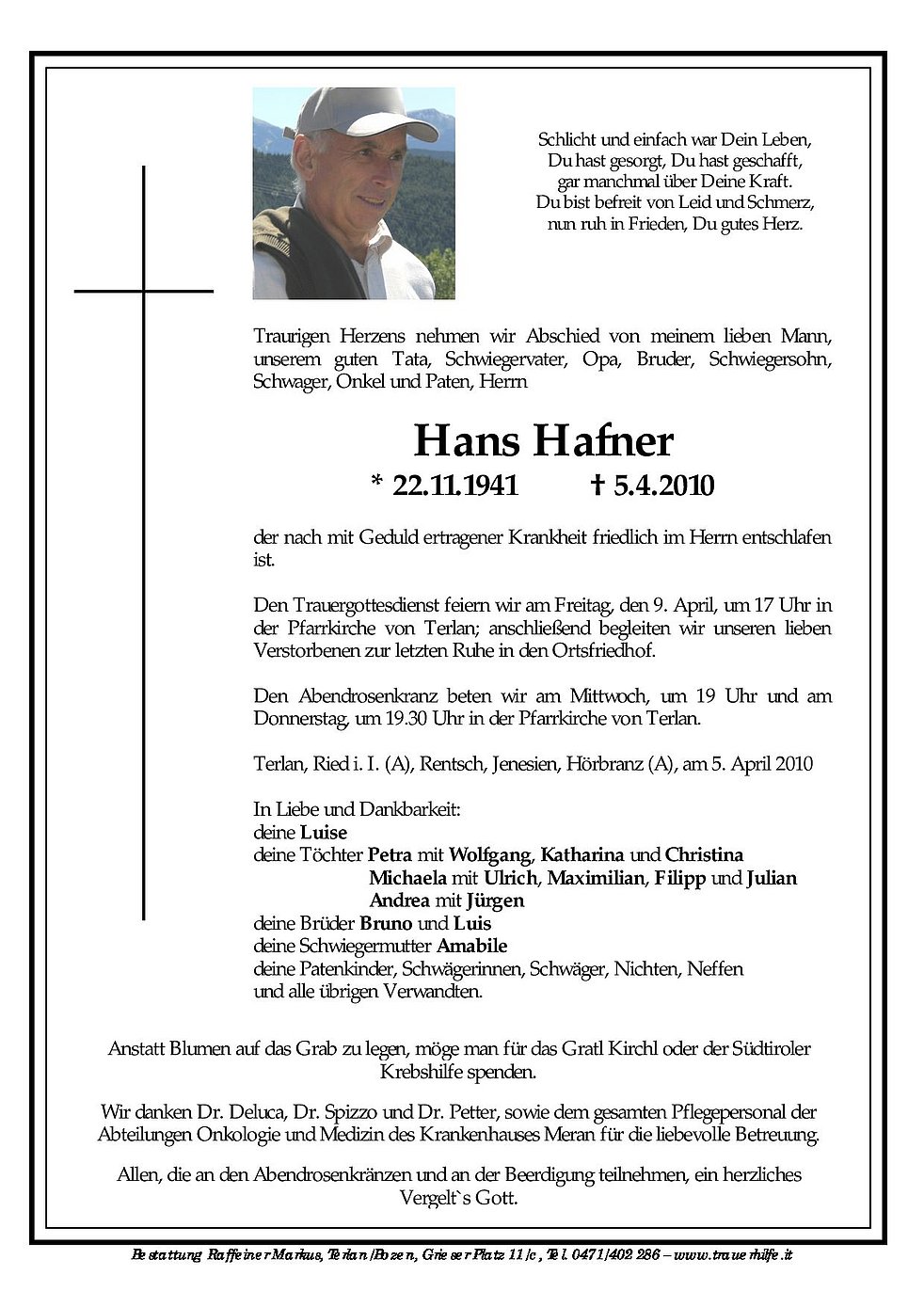 Den Trauergottesdienst feiern wir am Freitag, dem 9. April, um 17 Uhr in der Pfarrkirche von Terlan; anschließend begleiten wir unseren lieben Verstorbenen zur letzten Ruhe in den Ortsfriedhof.