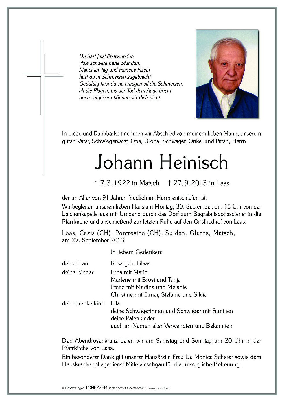 Wir begleiten unseren lieben Hans am Montag, 30. September, um 16 Uhr von der Leichenkapelle aus mit Umgang durch das Dorf zum Begräbnisgottesdienst in die Pfarrkirche und anschließend zur letzten Ruhe auf den Ortsfriedhof von Laas.