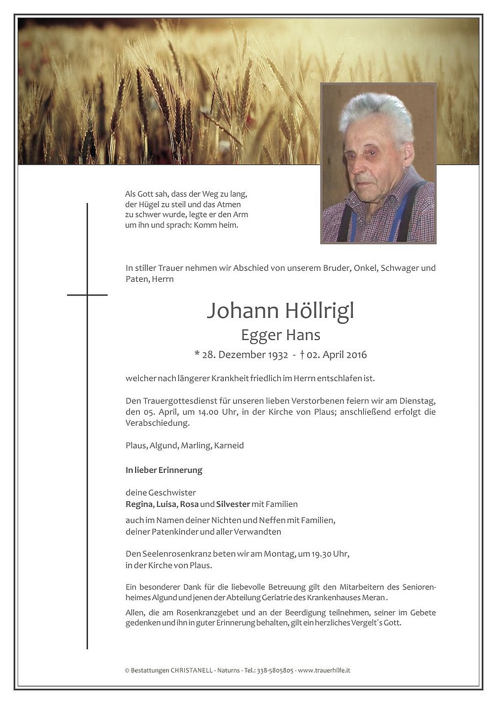 Den Trauergottesdienst für unseren lieben Verstorbenen feiern wir am Dienstag, den 05. April, um 14.00 Uhr, in der Kirche von Plaus; anschließend erfolgt die Verabschiedung.