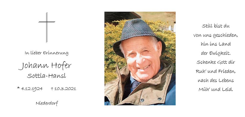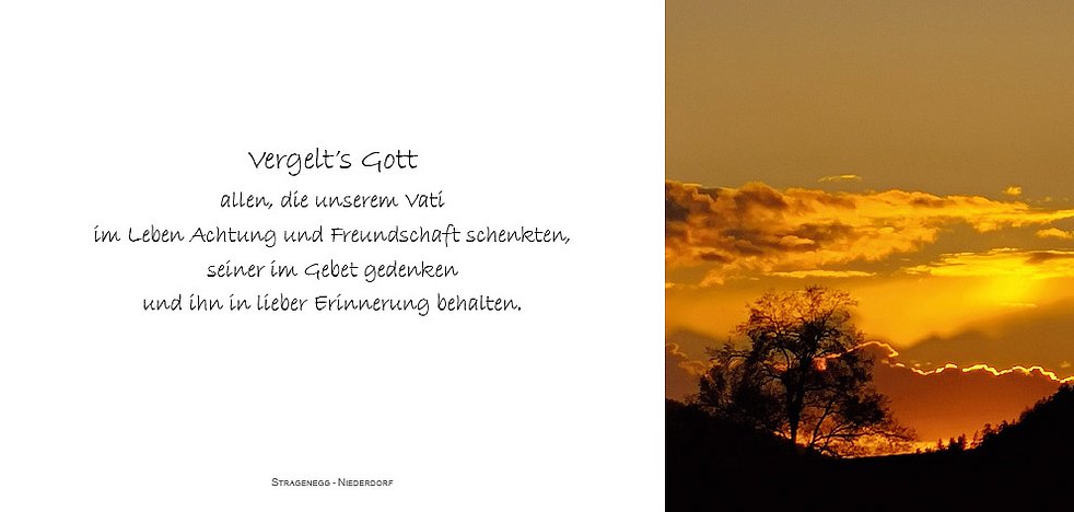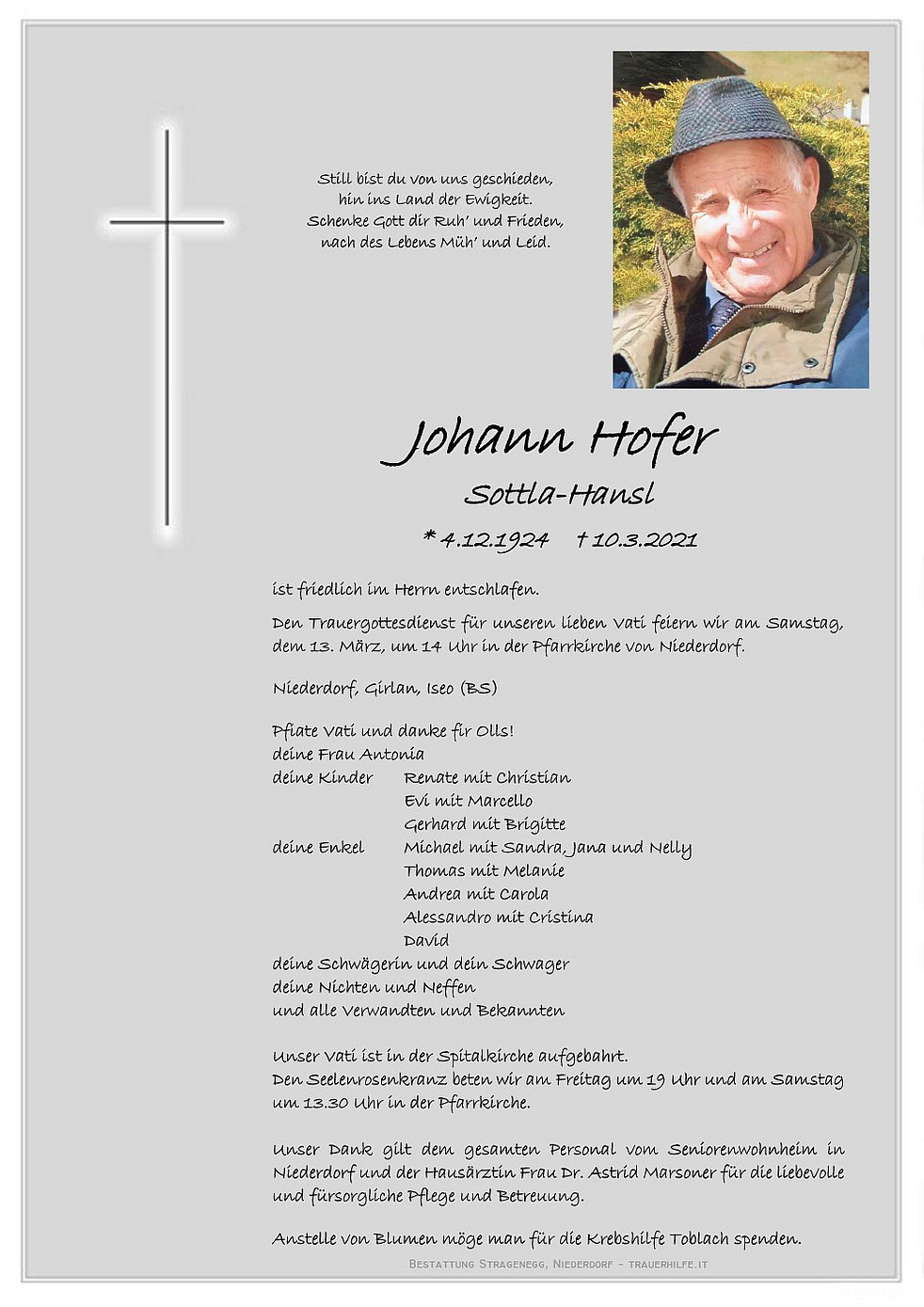 Den Trauergottesdienst für unseren lieben Vati feiern wir am Samstag, dem 13. März, um 14 Uhr in der Pfarrkirche von Niederdorf.