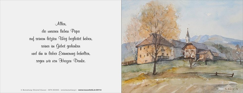 Ein herzliches Vergelt’s Gott gilt dem Hausarzt Herrn Dr. Martin Kofler, Frau Dr. Monika Hilber vom Palliativzentrum am Krankenhaus Bruneck, den Sprengelschwestern und der Pflegerin Tanja.