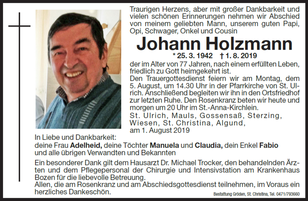 Den Trauergottesdienst feiern wir am Montag, dem 5 August, um 14.30 Uhr in der Pfarrkirche von St. Ulrich Anschließend begleiten wir ihn in den Ortsfriedhof zur letzten Ruhe.