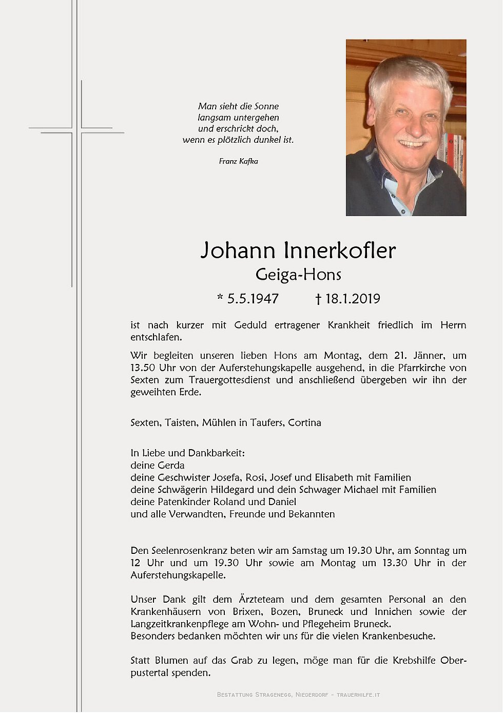 Wir begleiten unseren lieben Hons am Montag, dem 21. Jänner, um 13.50 Uhr von der Auferstehungskapelle ausgehend, in die Pfarrkirche von Sexten zum Trauergottesdienst und anschließend übergeben wir ihn der geweihten Erde.