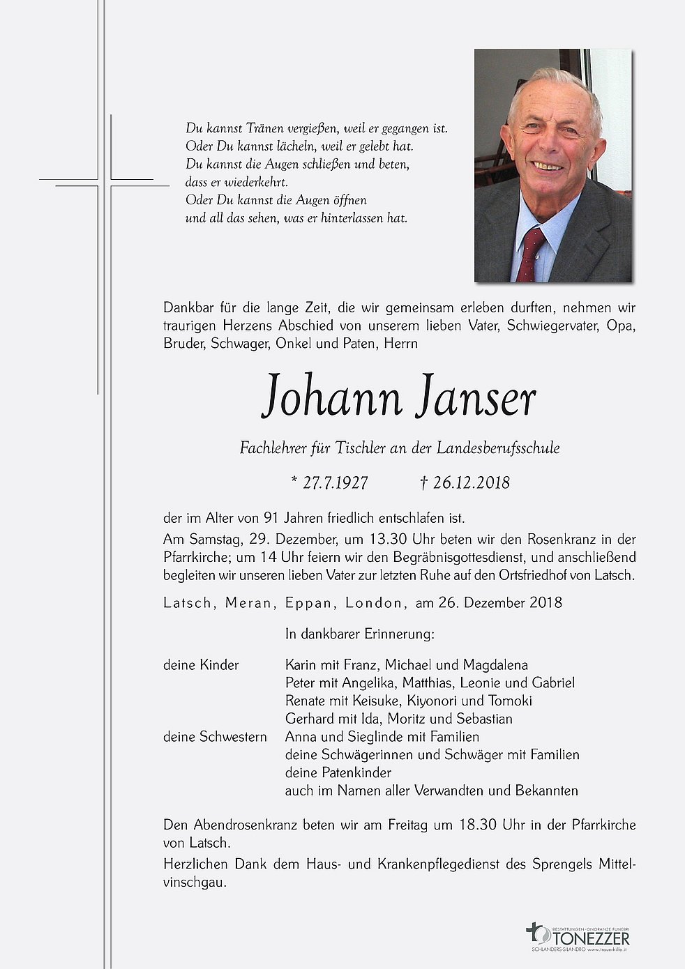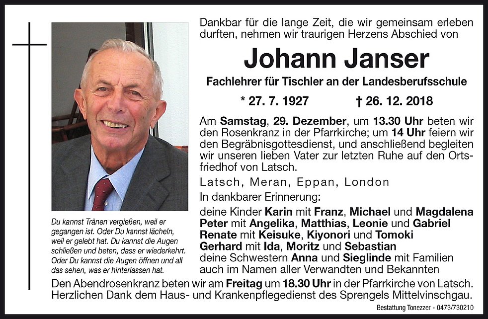 um 14 Uhr feiern wir den Begräbnisgottesdienst, und anschließend begleiten wir unseren lieben Vater zur letzten Ruhe auf den Ortsfriedhof von Latsch.