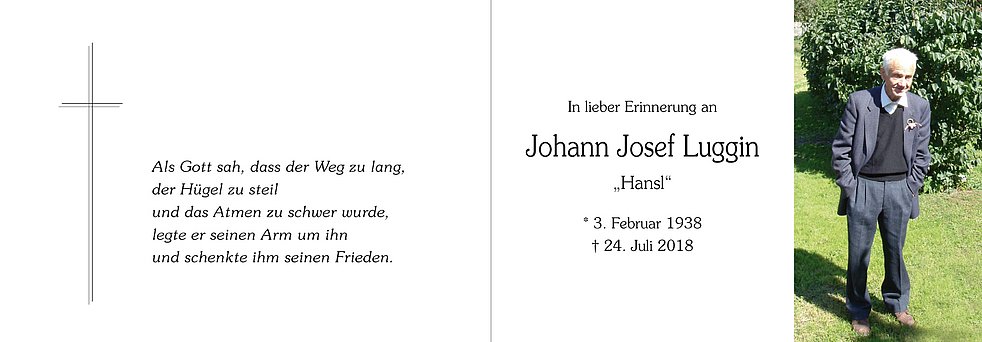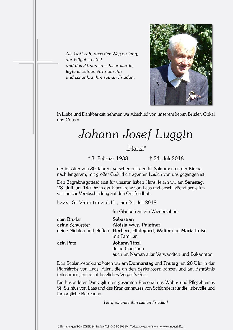 Den Begräbnisgottesdienst für unseren lieben Hansl feiern wir am Samstag, 28. Juli, um 14 Uhr in der Pfarrkirche von Laas und anschließend begleiten wir ihn zur Verabschiedung auf den Ortsfriedhof.