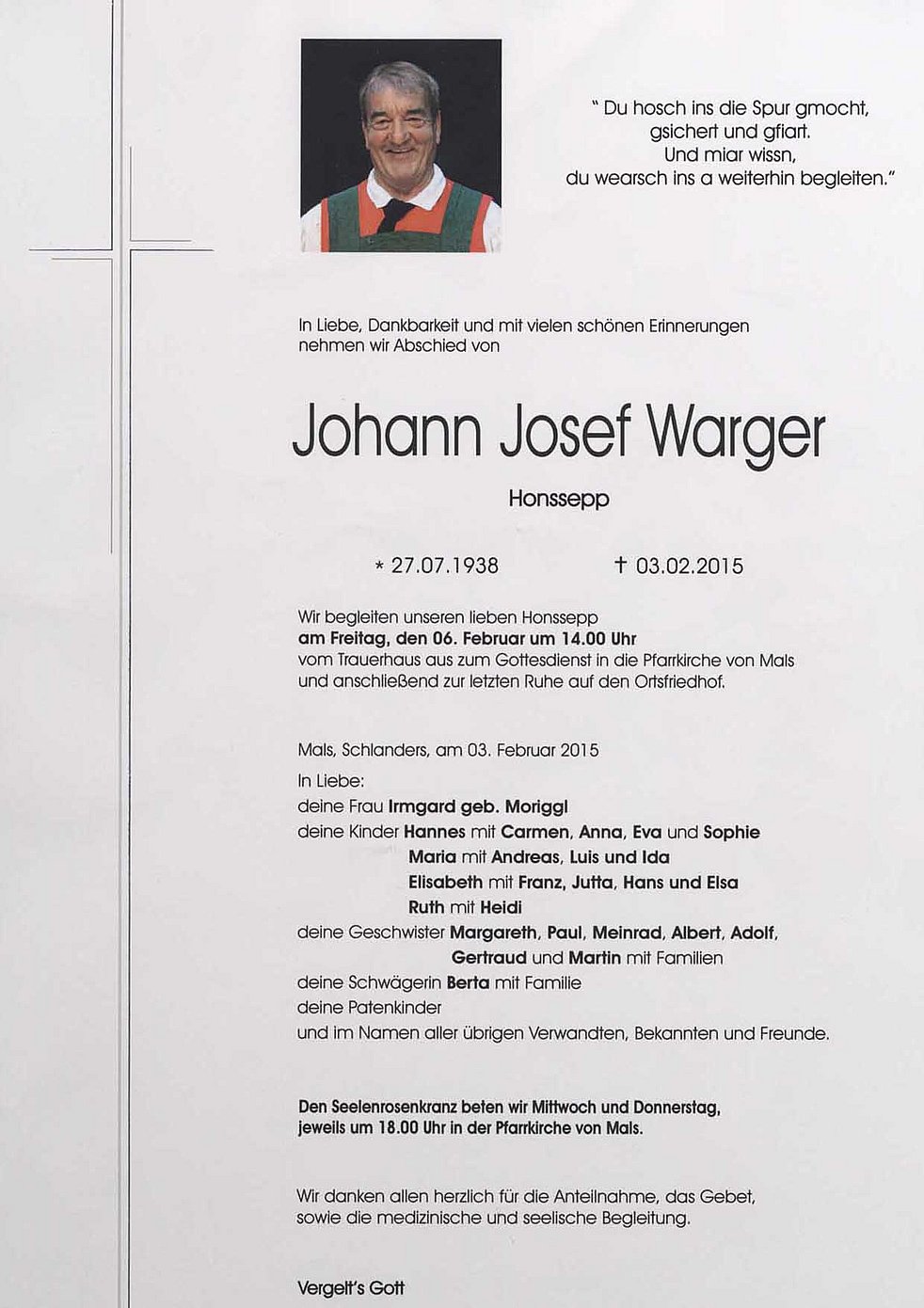 Wir begleiten unseren lieben Honssepp am Freitag, dem 6. Februar, um 14 Uhr vom Trauerhaus aus zum Gottesdienst in die Pfarrkirche von Mals und anschließend zur letzten Ruhe auf den Ortsfriedhof.