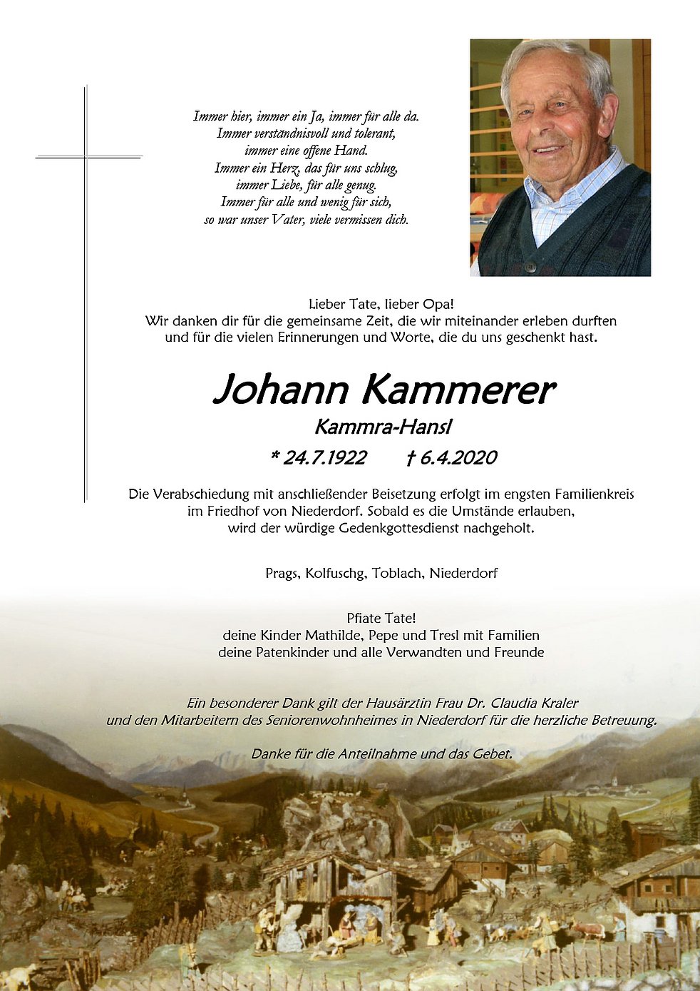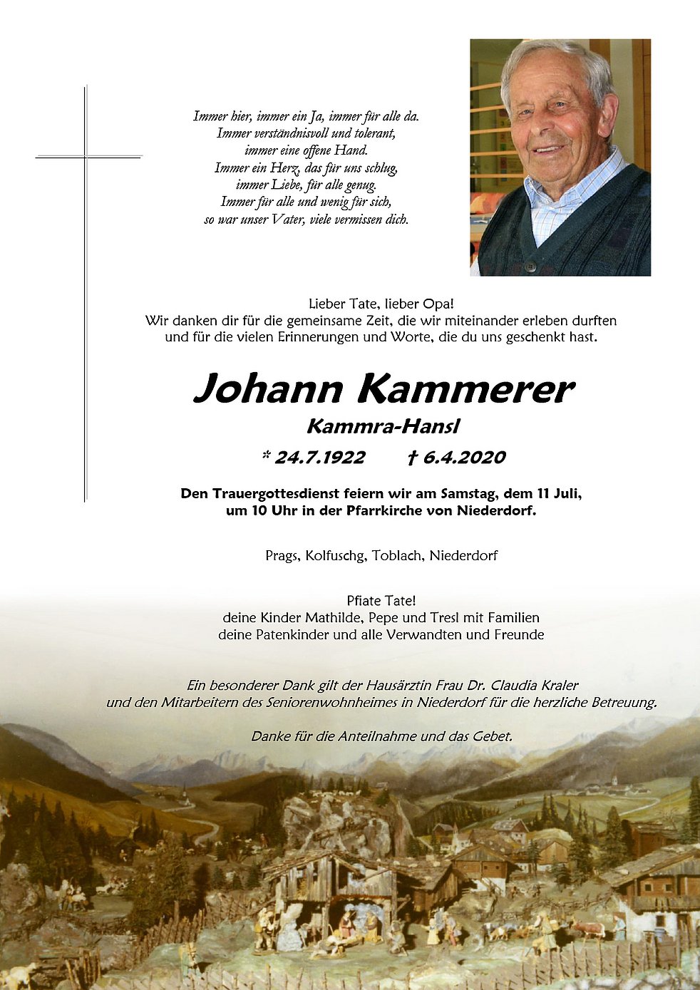 Den Trauergottesdienst feiern wir am Samstag, dem 11. Juli, um 10 Uhr in der Pfarrkirche von Niederdorf.