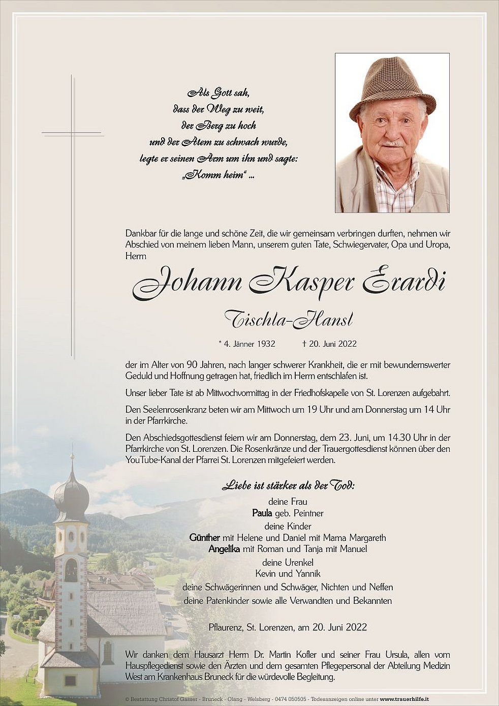 Den Abschiedsgottesdienst feiern wir am Donnerstag, dem 23. Juni, um 14.30 Uhr in der Pfarrkirche von St. Lorenzen. Die Rosenkränze und der Trauergottesdienst können über den YouTube-Kanal der Pfarrei St. Lorenzen mitgefeiert werden.