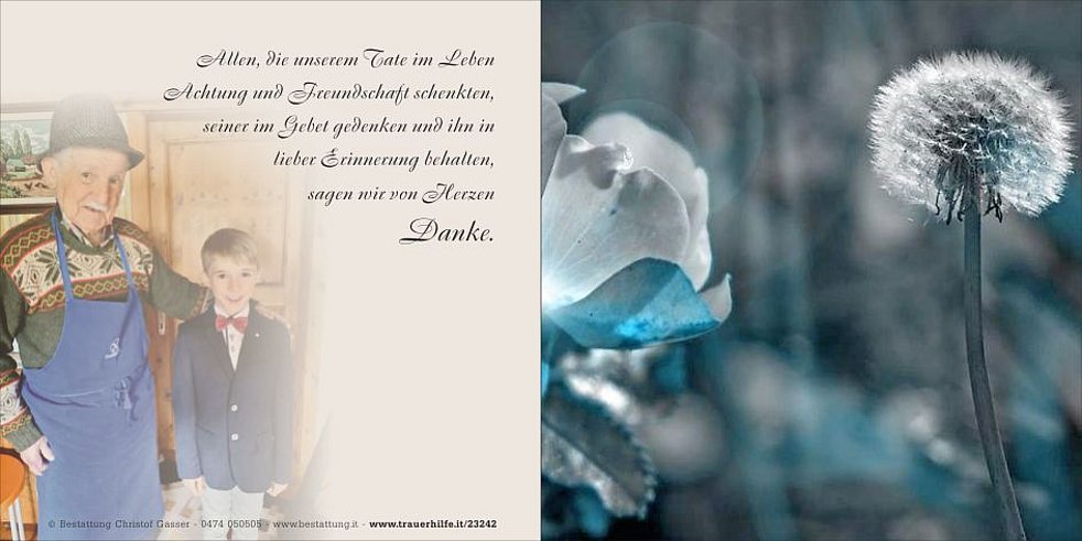Wir danken dem Hausarzt Herrn Dr. Martin Kofler und seiner Frau Ursula, allen vom Hauspflegedienst sowie den Ärzten und dem gesamten Pflegepersonal der Abteilung Medizin West am Krankenhaus Bruneck für die würdevolle Begleitung.