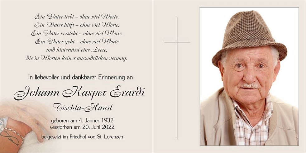 Unser lieber Tate ist ab Mittwochvormittag in der Friedhofskapelle von St. Lorenzen aufgebahrt.