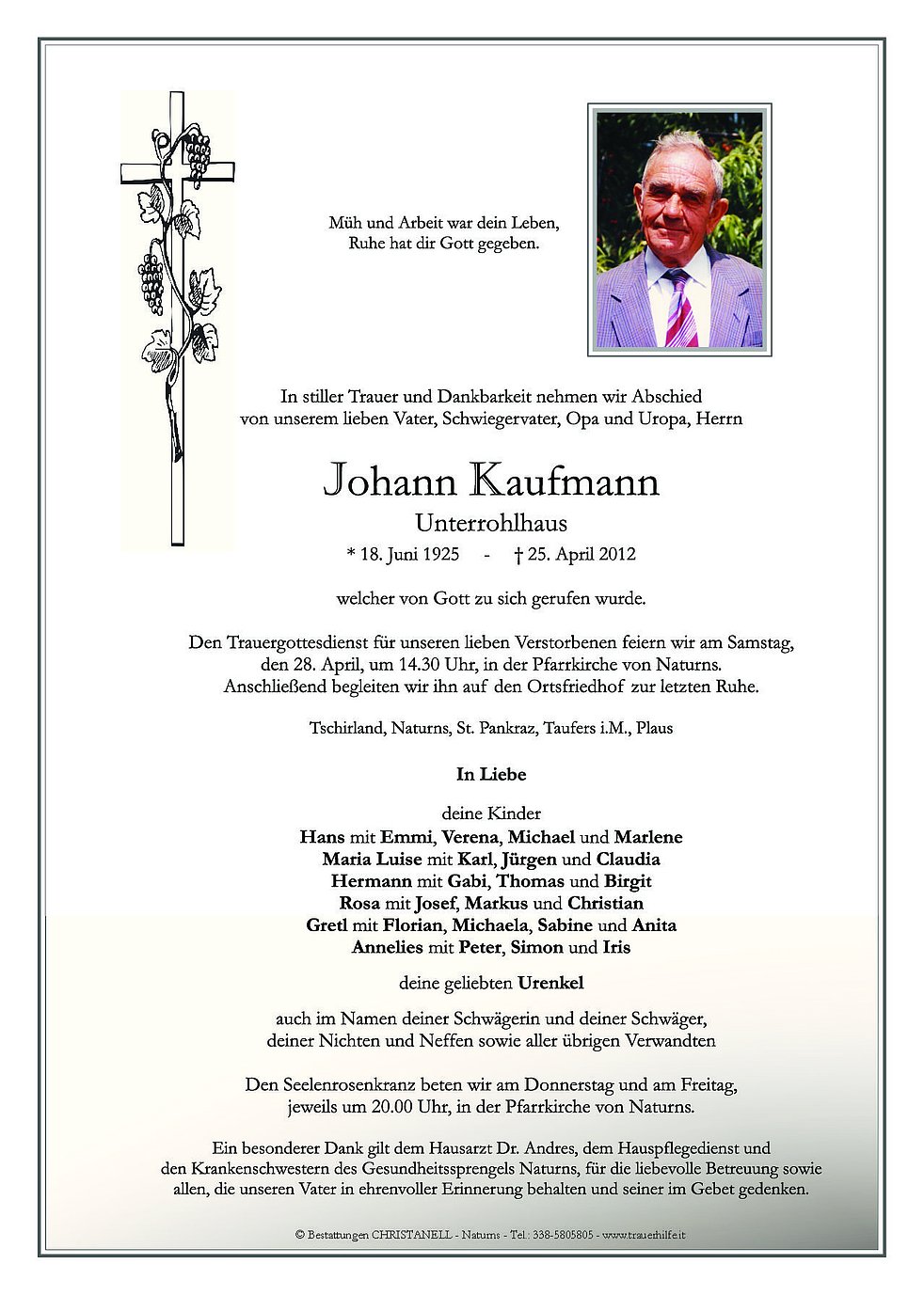 Ein besonderer Dank gilt dem Hausarzt Dr. Andres, dem Hauspflegedienst und den Krankenschwestern des Gesundheitssprengels Naturns, für die liebevolle Betreuung sowie allen, die unseren Vater in ehrenvoller Erinnerung behalten und seiner im Gebet gedenken.
