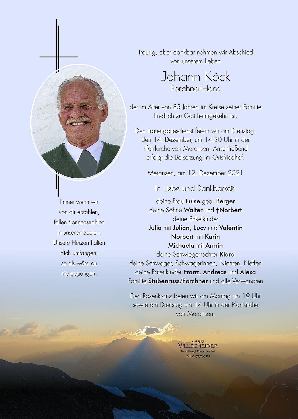 von Günter Raab haben wir heute erfahren, dass Dein lieber Mann sich von dieser Welt verabschiedet hat. Das macht uns sehr traurig, zumal wir so schöne Erinnerungen an Euch und Meransen haben. Wir sprechen Dir und allen Angehörigen unsere aufrichtige Anteilnahme aus. Wir senden an Hans auf diesem Weg einen letzten Gruß, w i r werden ihn nicht vergessen !!