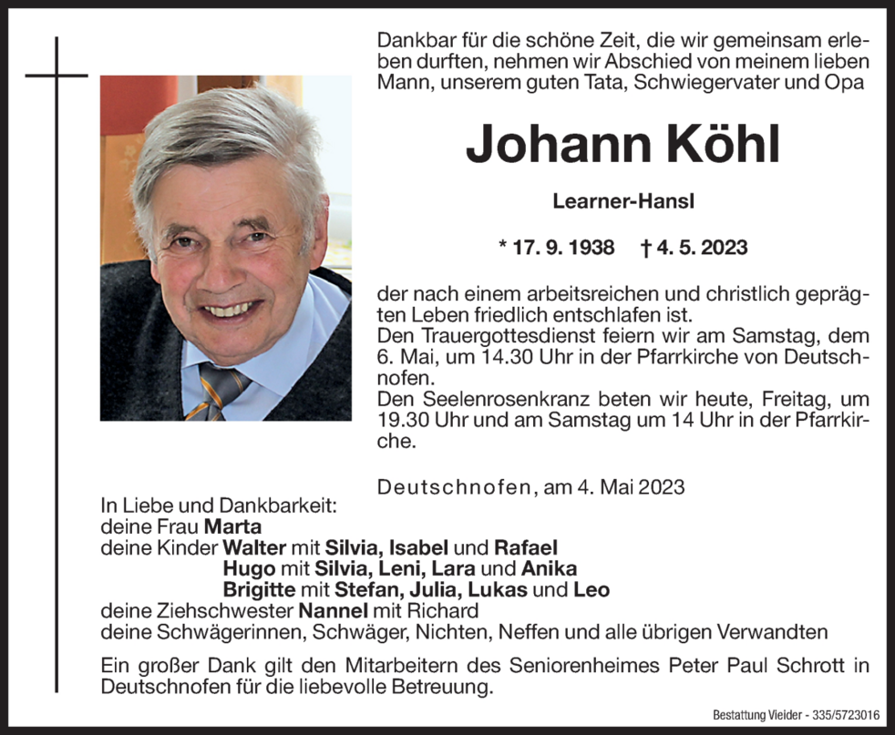 Den Trauergottesdienst feiern wir am Samstag, dem 6. Mai um 14.30 Uhr in der Pfarrkirche von Deutschnofen.