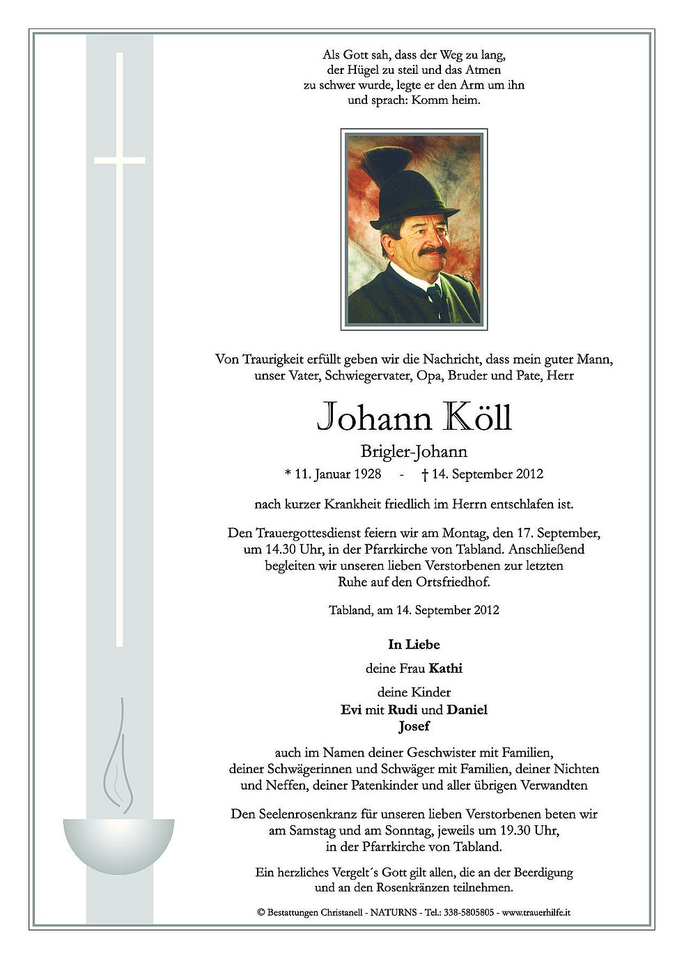Den Trauergottesdienst feiern wir am Montag, den 17. September, um 14.30 Uhr, in der Pfarrkirche von Tabland. Anschließend begleiten wir unseren lieben Verstorbenen zur letzten Ruhe auf den Ortsfriedhof.