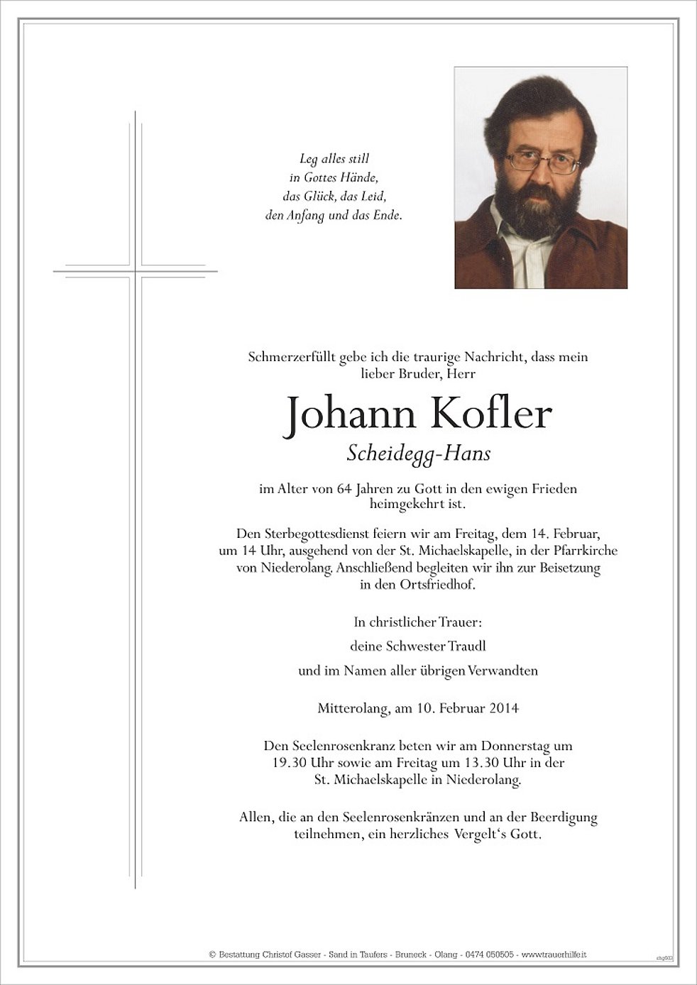 Den Sterbegottesdienst feiern wir am Freitag, dem 14. Februar, um 14 Uhr, ausgehend von der St. Michaelskapelle, in der Pfarrkirche von Niederolang. Anschließend begleiten wir ihn zur Beisetzung