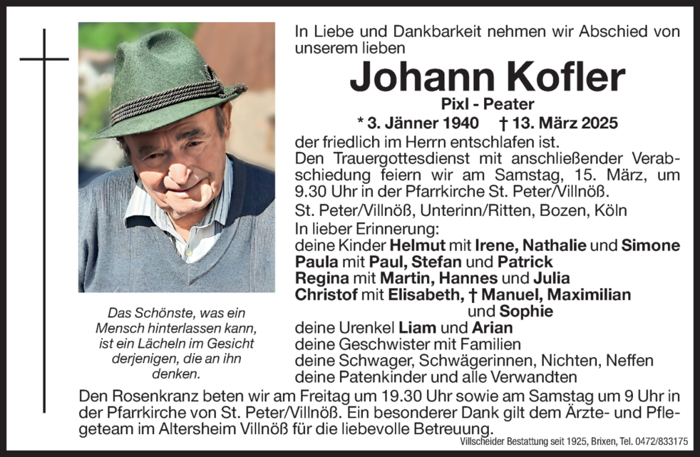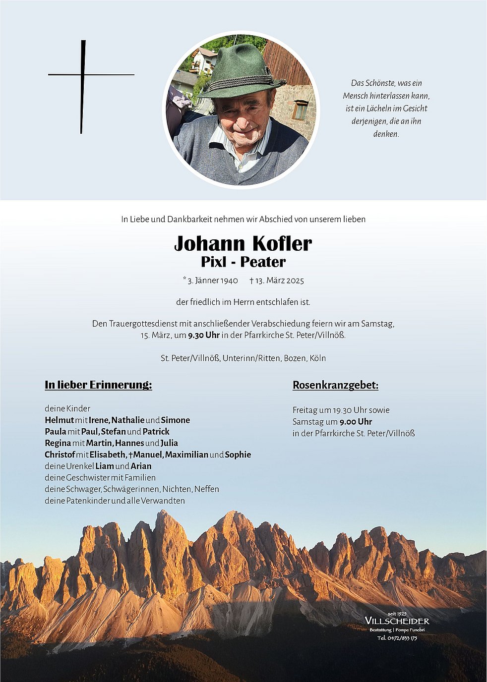 Trauerfeier: 15.03. - 09:30 Uhr St. Peter/Villnöß