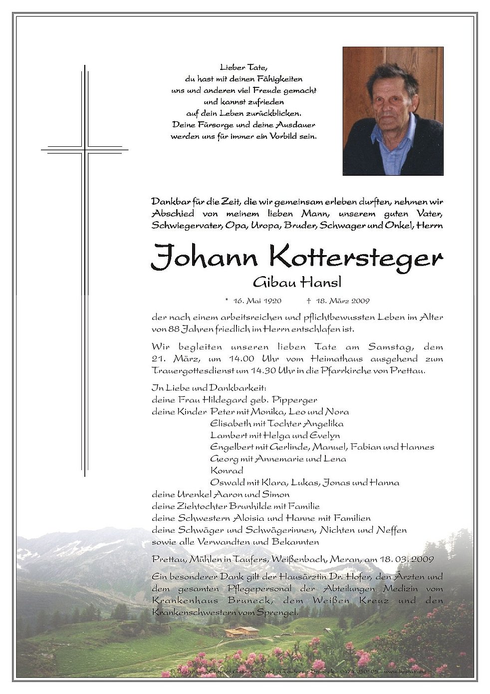 21. März, um 14.00 Uhr vom Heimathaus ausgehend zum Trauergottesdienst um 14.30 Uhr in die Pfarrkirche von Prettau.