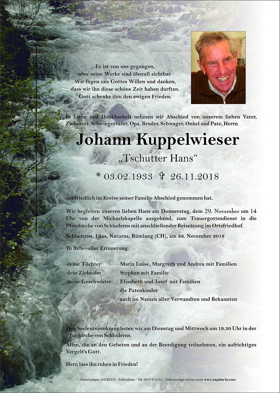 Wir begleiten unseren lieben Hans am Donnerstag, dem 29. November um 14 Uhr von der Michaelskapelle ausgehend, zum Trauergottesdienst in die Pfarrkirche von Schluderns mit anschließender Beisetzung im Ortsfriedhof.