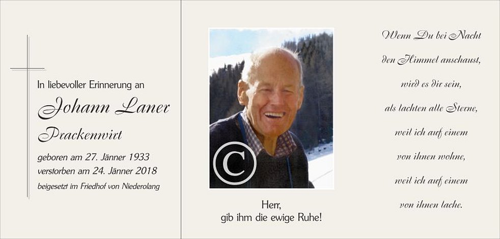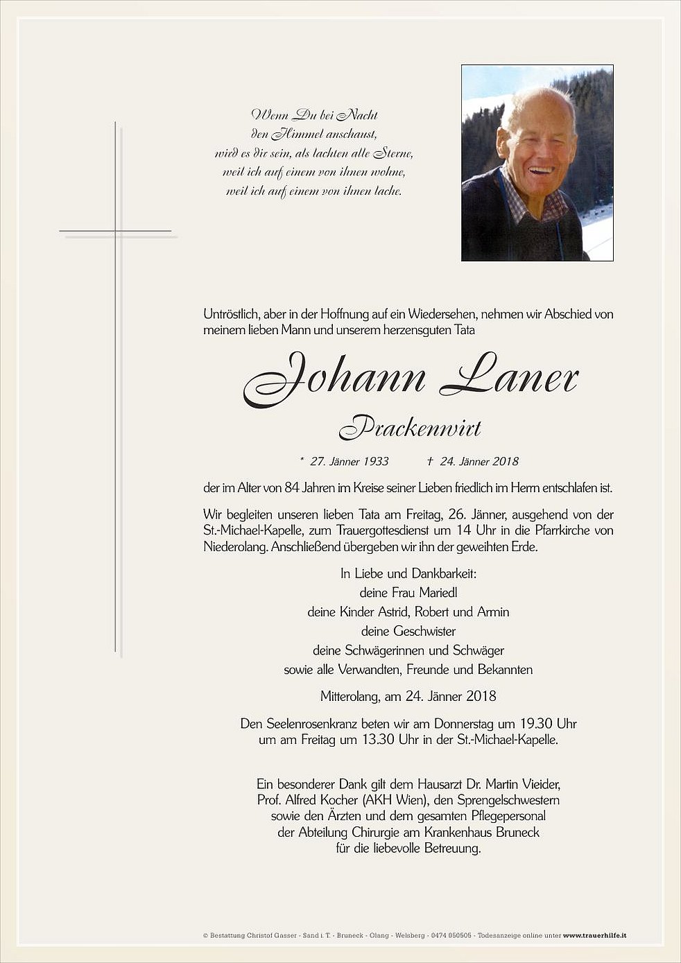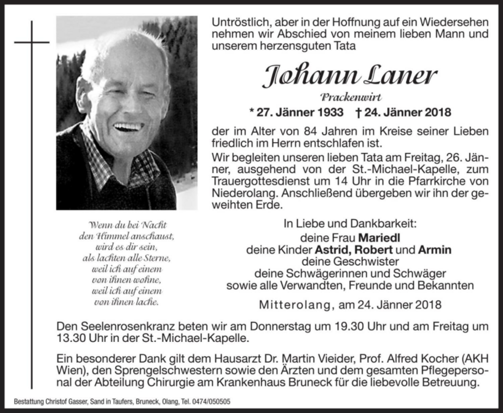 Wir begleiten unseren lieben Tata am Freitag, 26. Jänner, ausgehend von der St.-Michael-Kapelle, zum Trauergottesdienst um 14 Uhr in die Pfarrkirche von Niederolang. Anschließend übergeben wir ihn der geweihten Erde.