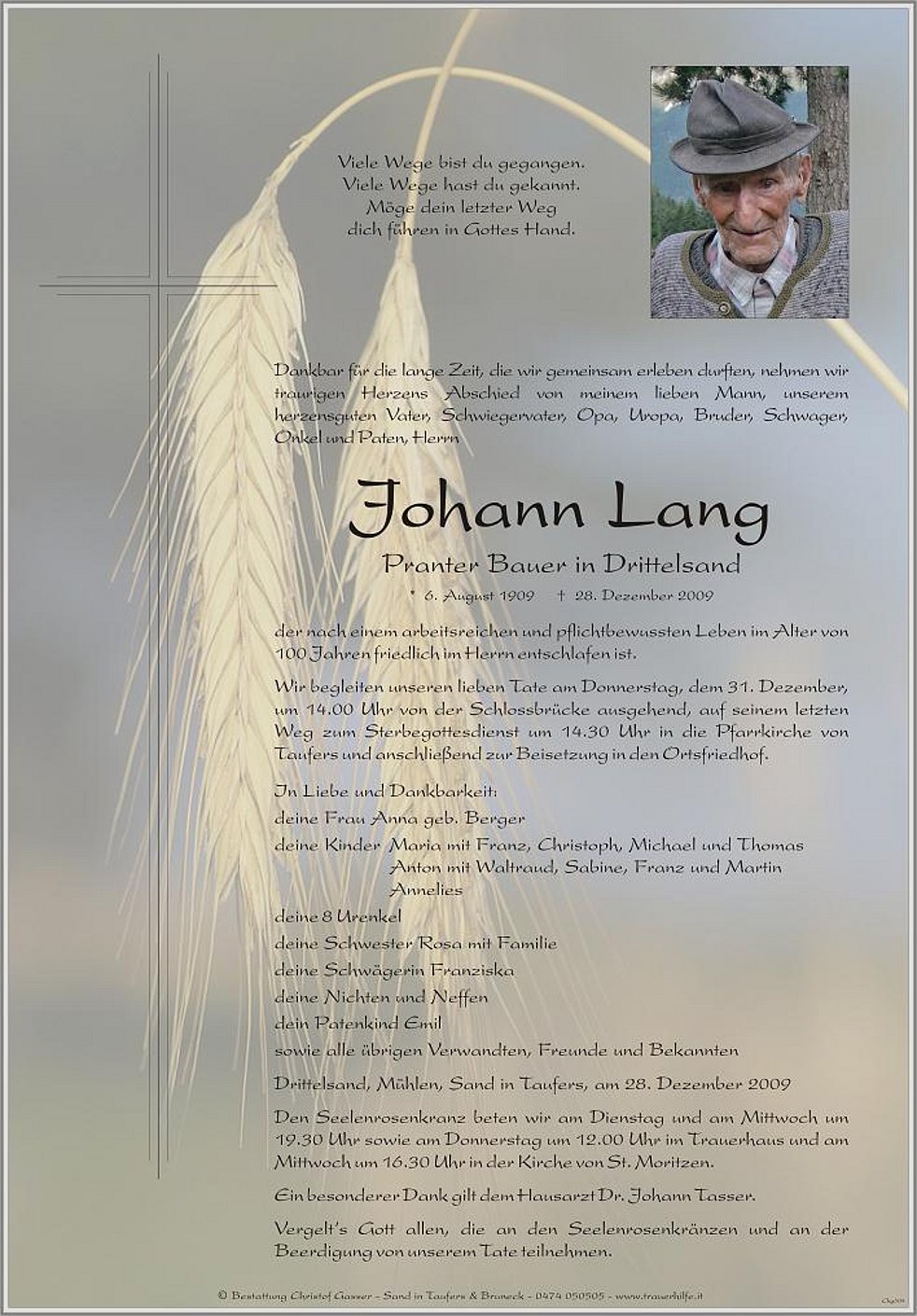 Wir begleiten unseren lieben Tate am Donnerstag, dem 31. Dezember, um 14.00 Uhr von der Schlossbrücke ausgehend, auf seinem letzten Weg zum Sterbegottesdienst um 14.30 Uhr in die Pfarrkirche von Taufers und anschließend zur Beisetzung in den Ortsfriedhof.