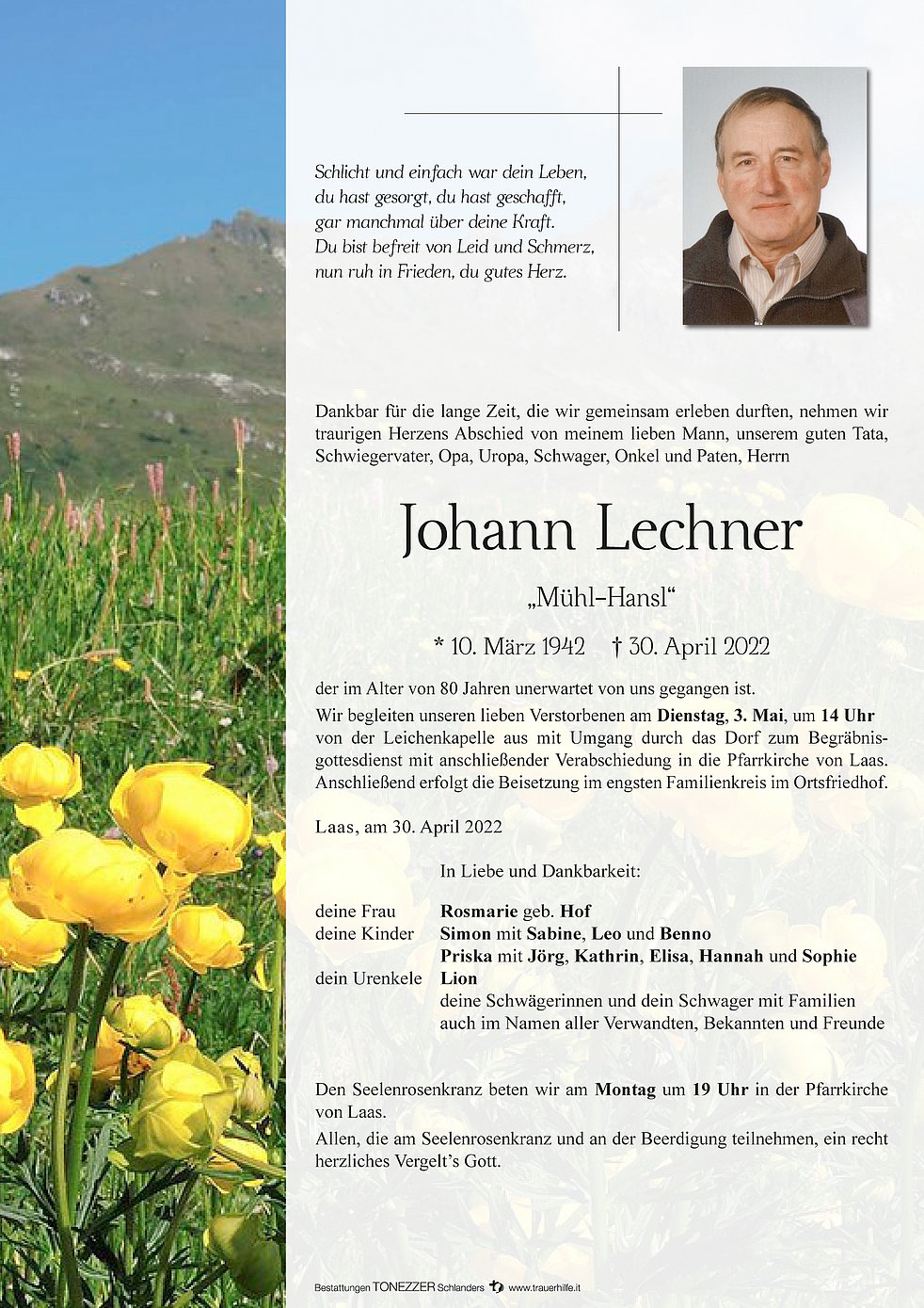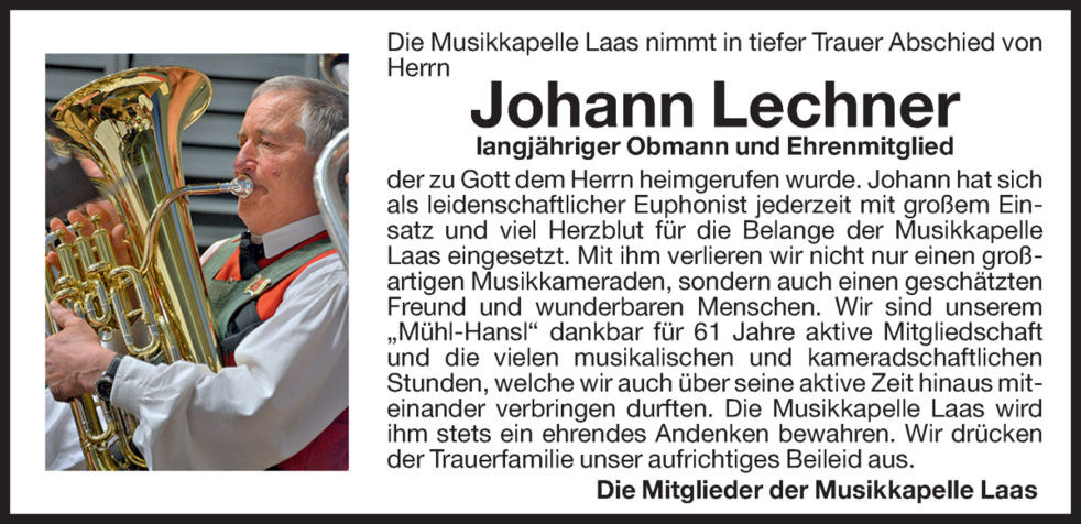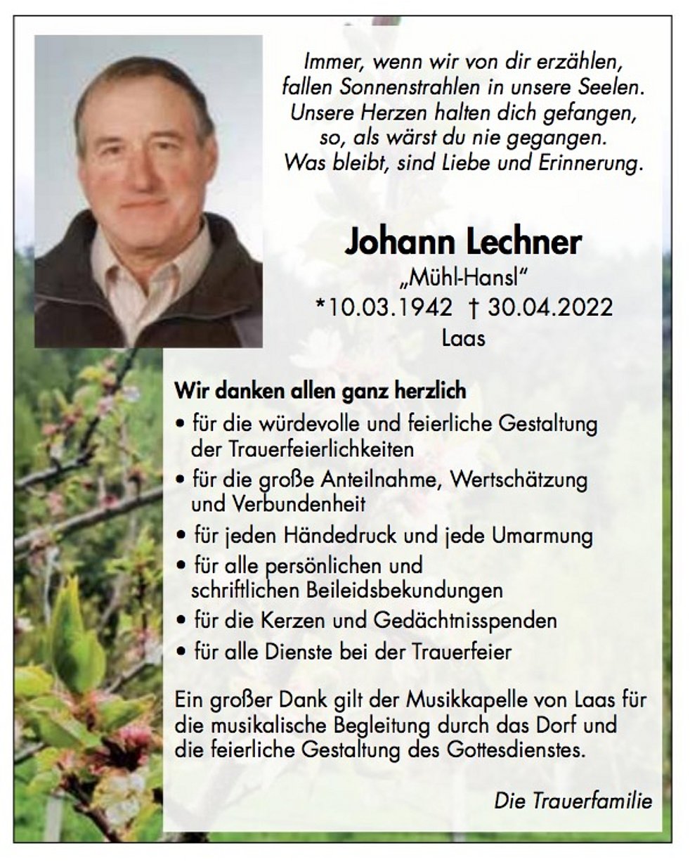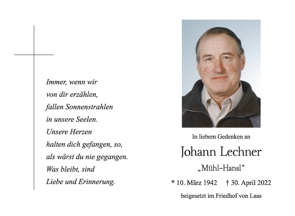 Wir begleiten unseren lieben Verstorbenen am Dienstag, 3. Mai, um 14 Uhr von der Leichenkapelle aus mit Umgang durch das Dorf zum Begräbnisgottesdienst mit anschließender Verabschiedung in die Pfarrkirche von Laas.