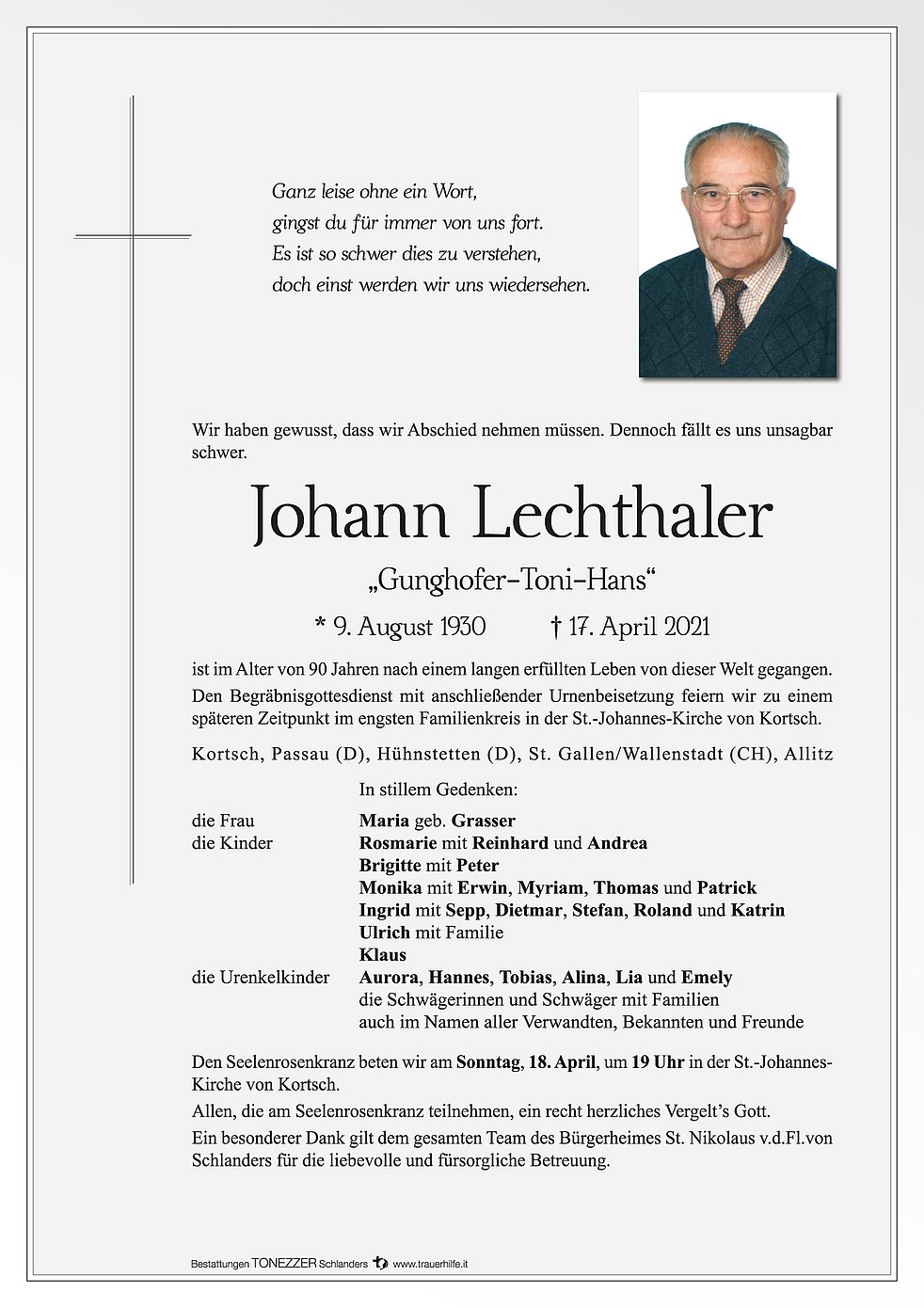 Ein besonderer Dank gilt dem gesamten Team des Bürgerheimes St. Nikolaus v.d.Fl.von Schlanders für die liebevolle und fürsorgliche Betreuung.