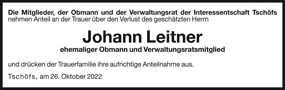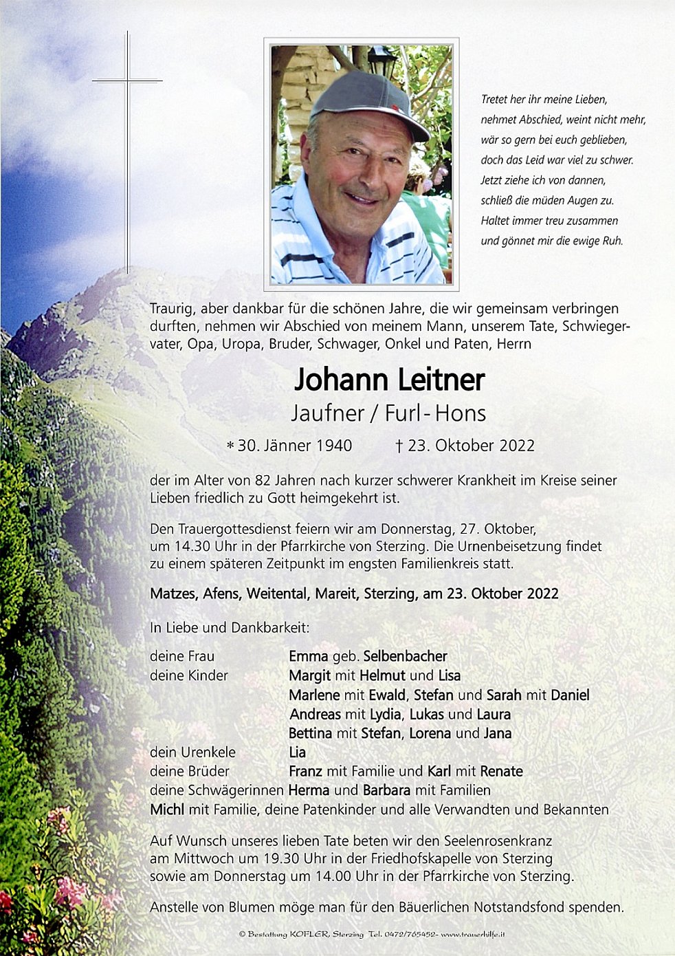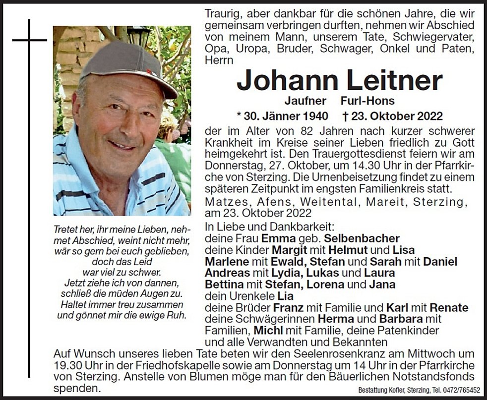 Den Trauergottesdienst feiern wir am Donnerstag, 27. Oktober, um 14.30 Uhr in der Pfarrkirche von Sterzing. Die Urnenbeisetzung findet zu einem späteren Zeitpunkt im engsten Familienkreis statt.