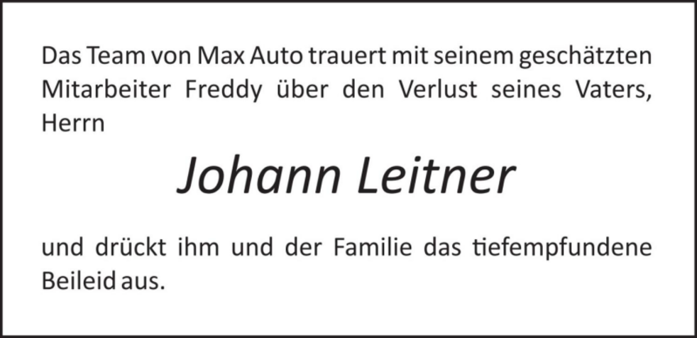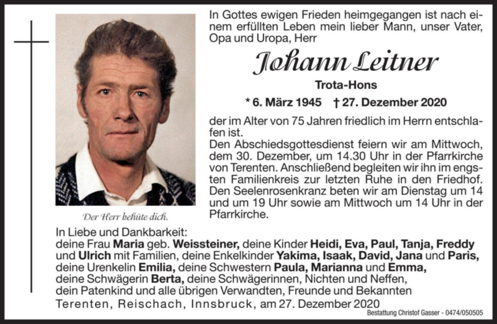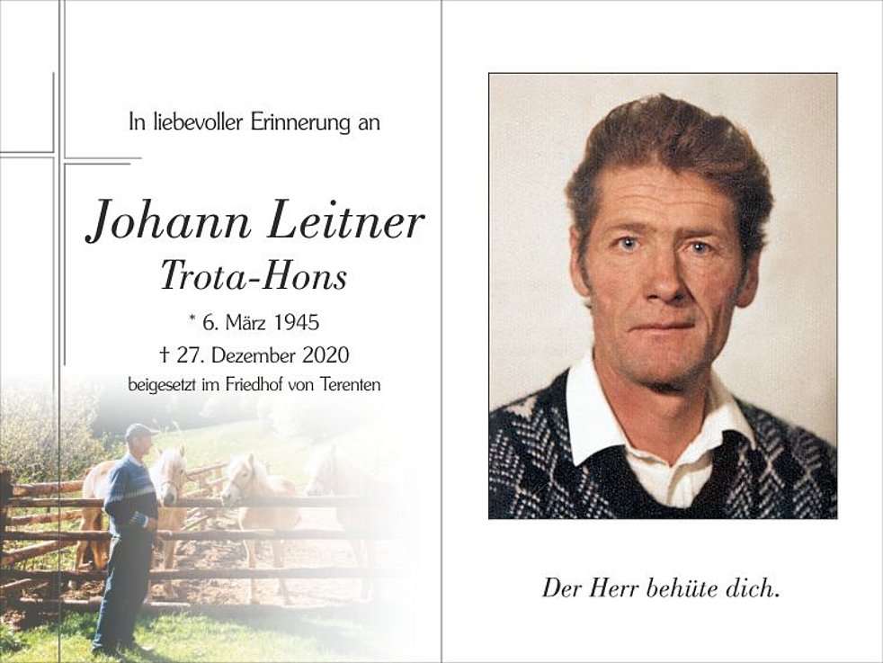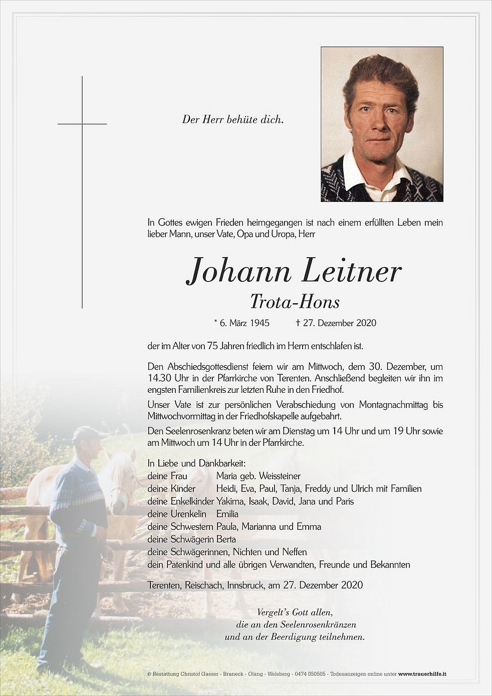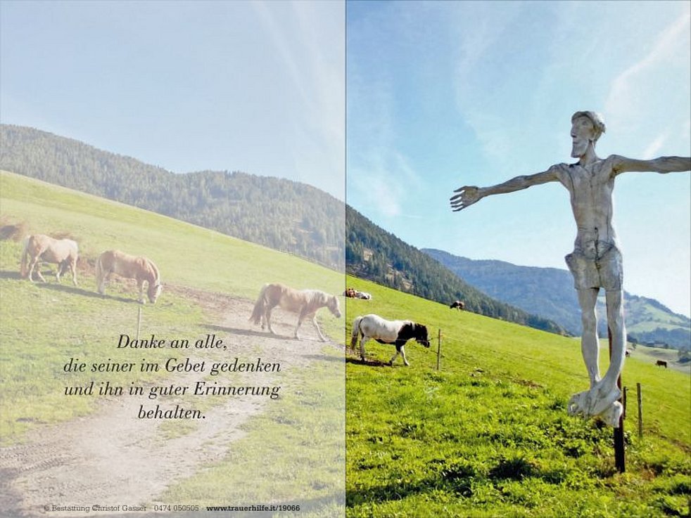 Den Abschiedsgottesdienst feiern wir am Mittwoch, dem 30. Dezember, um 14.30 Uhr in der Pfarrkirche von Terenten. Anschließend begleiten wir ihn im engsten Familienkreis zur letzten Ruhe in den Friedhof.