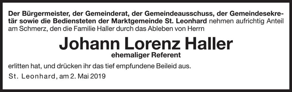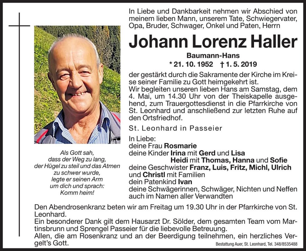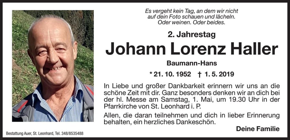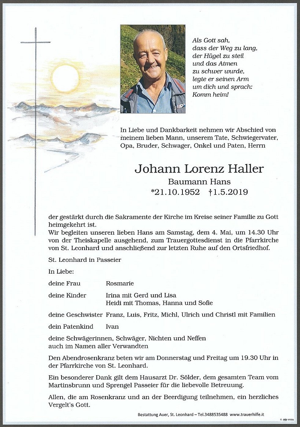 Wir begleiten unseren lieben Hans am Samstag, dem 4. Mai, um 14.30 Uhr von der Theiskapelle ausgehend, zum Trauergottesdienst in die Pfarrkirche von St. Leonhard und anschließend zur letzten Ruhe auf den Ortsfriedhof.