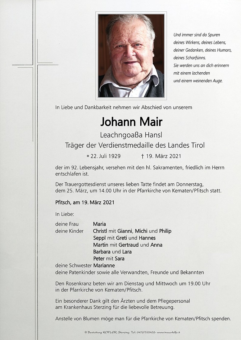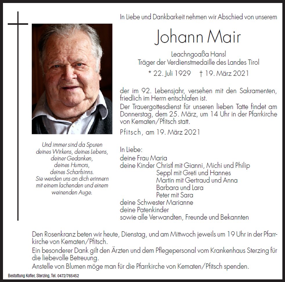 Der Trauergottesdienst unseres lieben Tatte findet am Donnerstag, dem 25. März, um 14.00 Uhr in der Pfarrkirche von Kematen/Pfitsch statt.