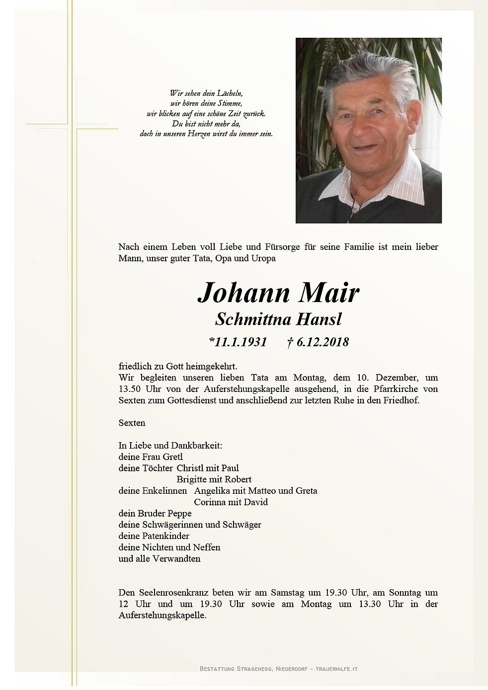Wir begleiten unseren lieben Tata am Montag, dem 10. Dezember, um 13.50 Uhr von der Auferstehungskapelle ausgehend, in die Pfarrkirche von Sexten zum Gottesdienst und anschließend zur letzten Ruhe in den Friedhof.