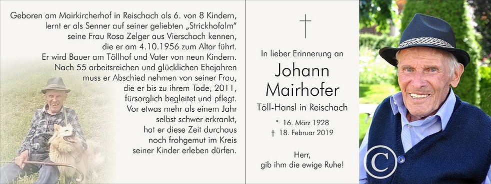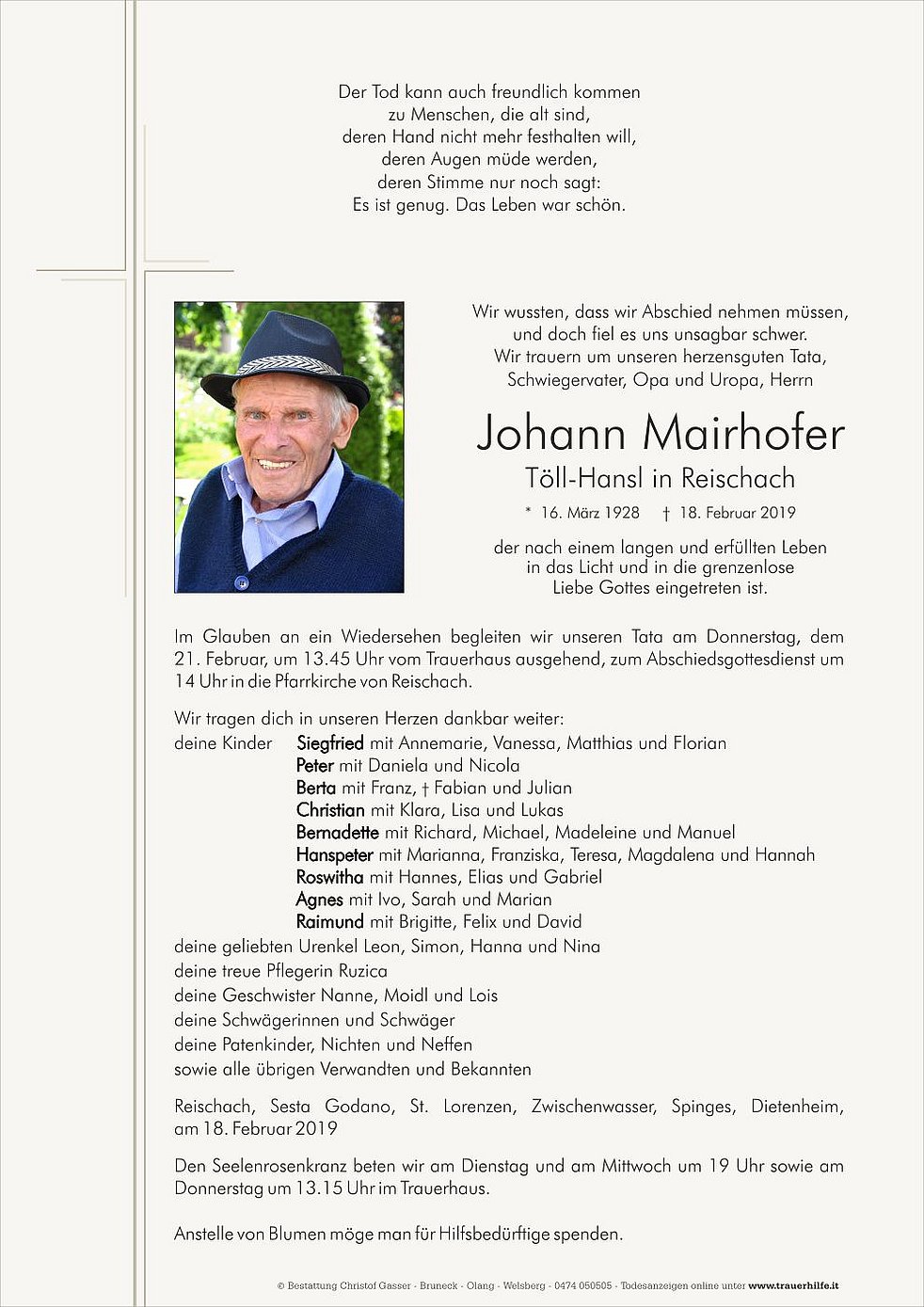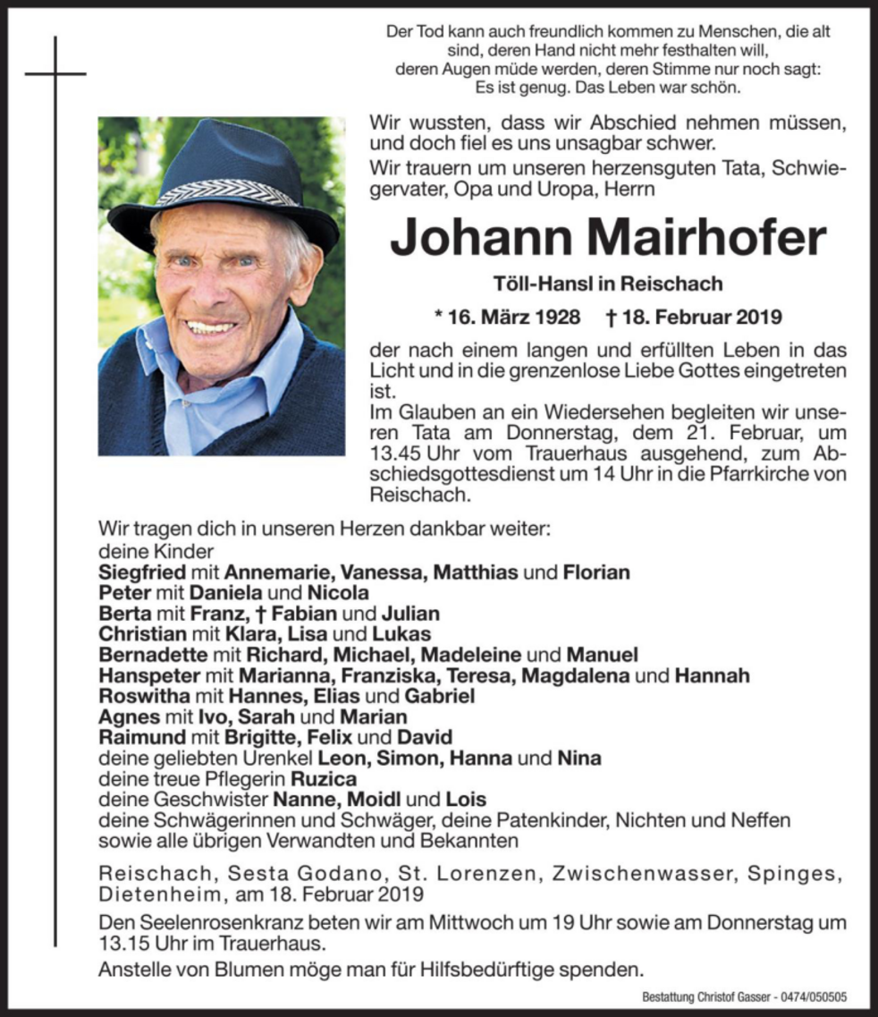 Im Glauben an ein Wiedersehen begleiten wir unseren Tata am Donnerstag, dem 21. Februar, um 13.45 Uhr vom Trauerhaus ausgehend, zum Abschiedsgottesdienst um 14 Uhr in die Pfarrkirche von Reischach.