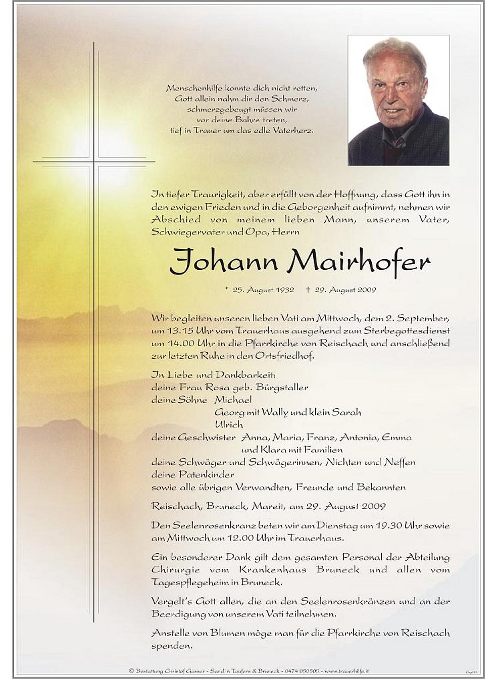 Wir begleiten unseren lieben Vati am Mittwoch, dem 2. September, um 13.15 Uhr vom Trauerhaus ausgehend zum Sterbegottesdienst um 14.00 Uhr in die Pfarrkirche von Reischach und anschließend zur letzten Ruhe in den Ortsfriedhof.