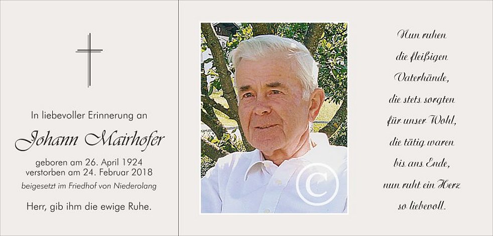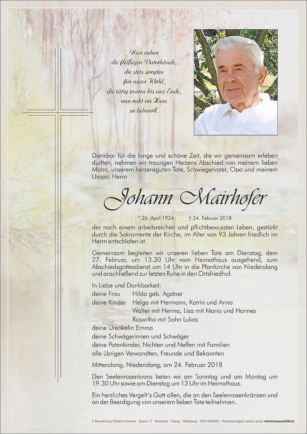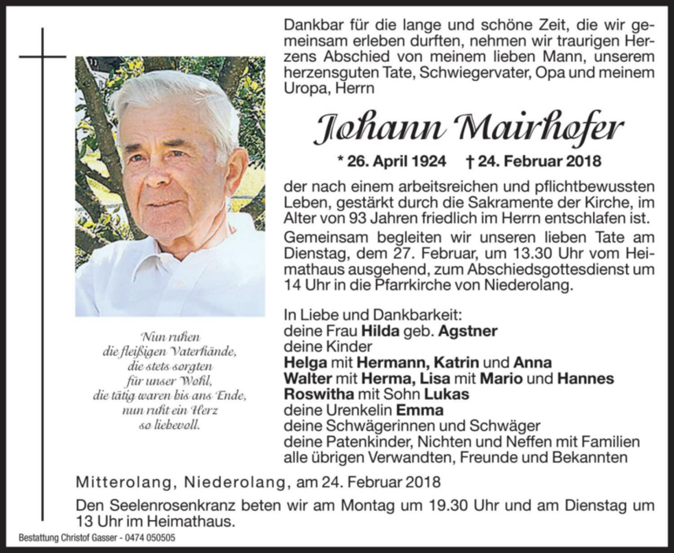 Gemeinsam begleiten wir unseren lieben Tate am Dienstag, dem 27. Februar, um 13.30 Uhr vom Heimathaus ausgehend, zum Abschiedsgottesdienst um 14 Uhr in die Pfarrkirche von Niederolang und anschließend zur letzten Ruhe in den Ortsfriedhof.