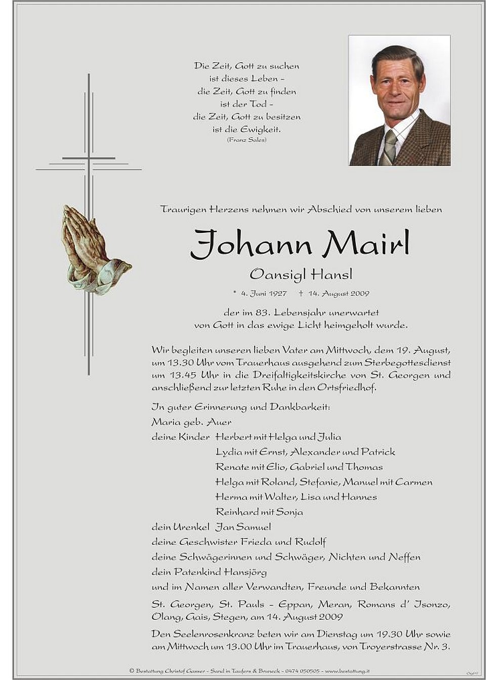 Wir begleiten unseren lieben Vater am Mittwoch, dem 19. August, um 13.30 Uhr vom Trauerhaus ausgehend zum Sterbegottesdienst um 13.45 Uhr in die Dreifaltigkeitskirche von St. Georgen und anschließend zur letzten Ruhe in den Ortsfriedhof.