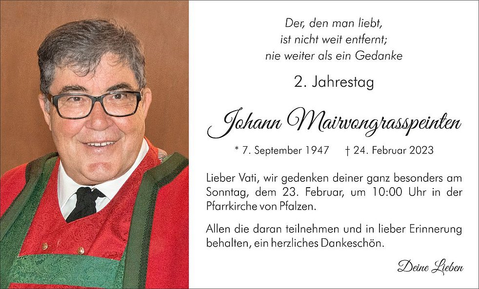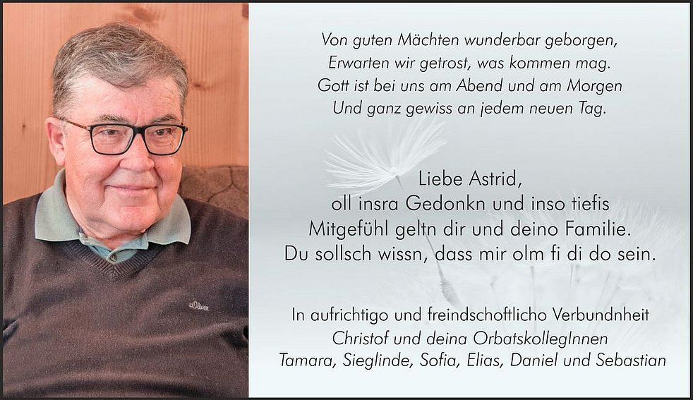 Den Trauergottesdienst feiern wir am Montag, dem 27. Februar, um 14.30 Uhr in der Pfarrkirche von Pfalzen. Anschließend übergeben wir ihn der geweihten Erde.