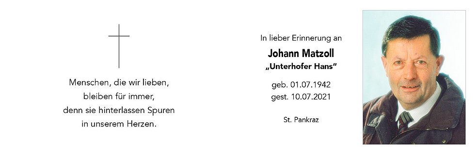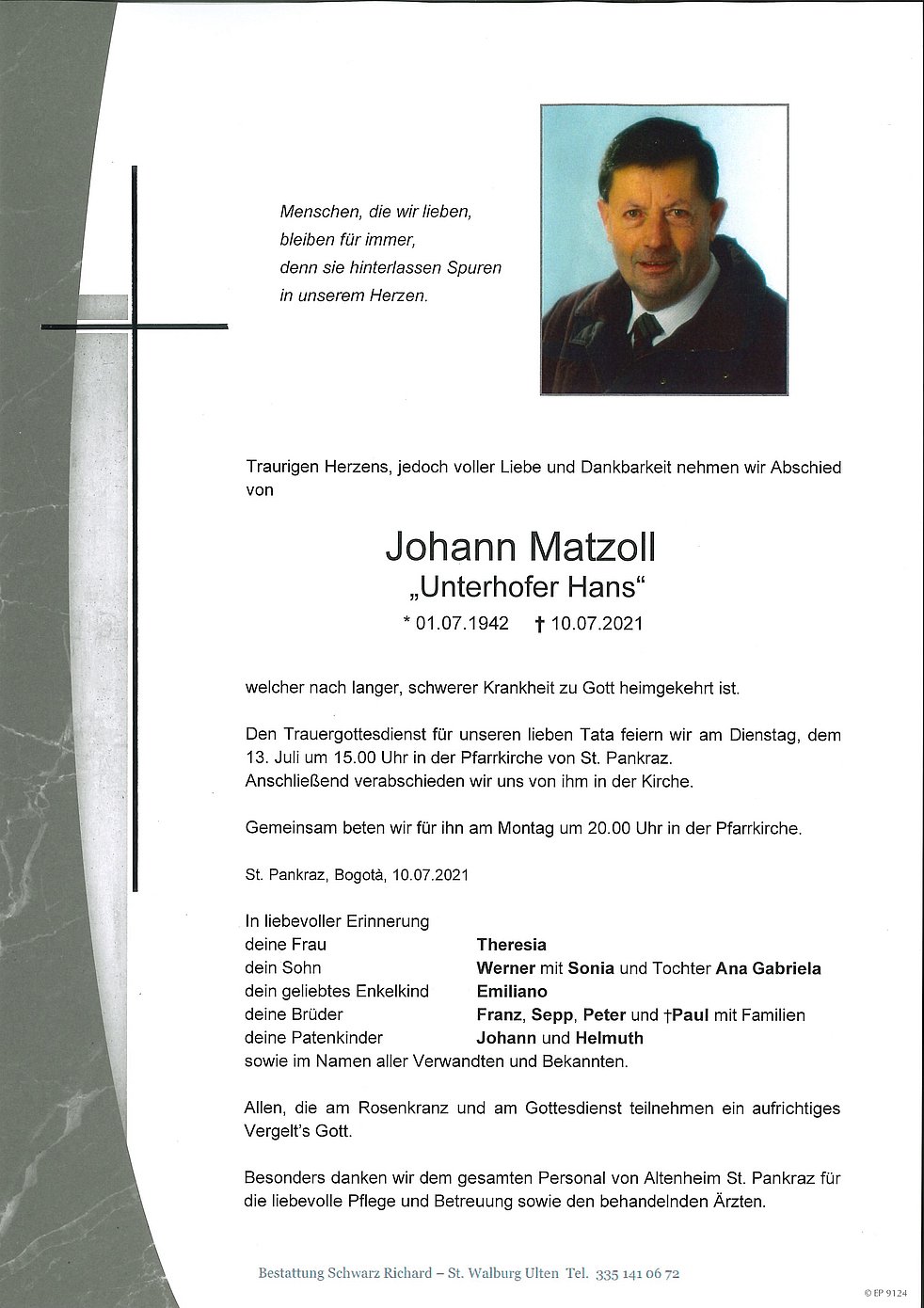Den Trauergottesdienst für unseren lieben Tata feiern wir am Dienstag, dem 13. Juli um 15.00 Uhr in der Pfarrkirche von St. Pankraz.