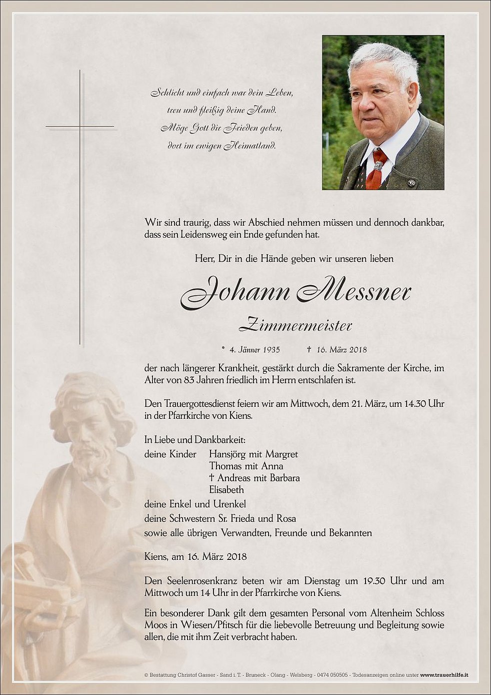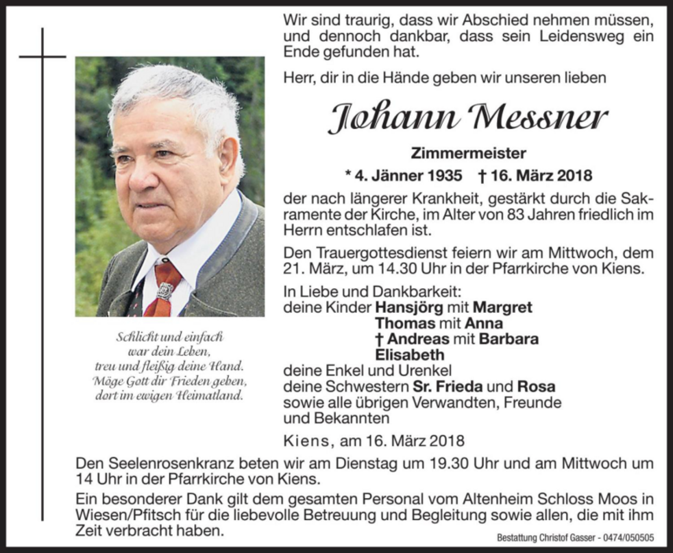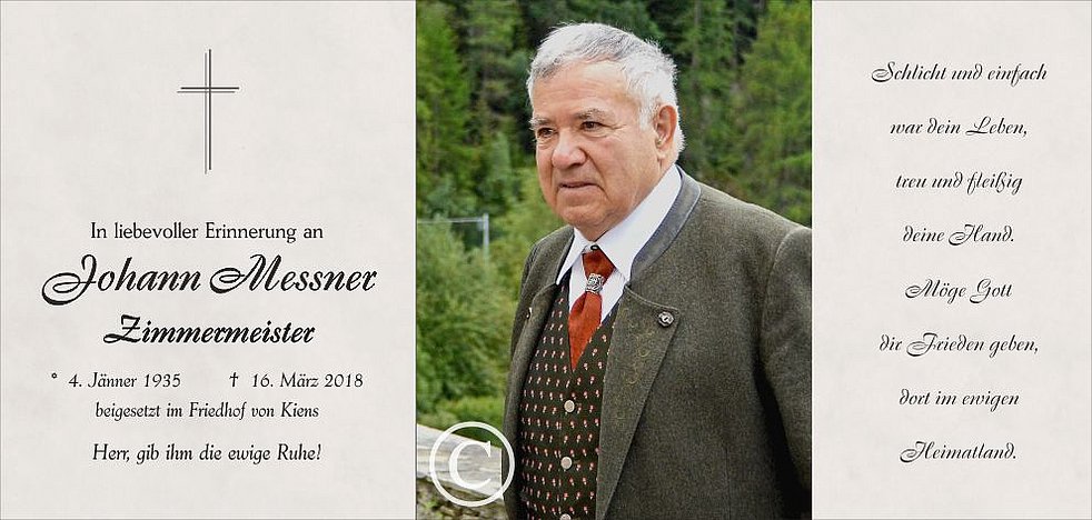 Den Trauergottesdienst feiern wir am Mittwoch, dem 21. März, um 14.30 Uhr in der Pfarrkirche von Kiens.