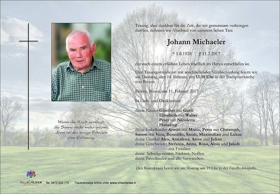 Den Trauergottesdienst mit anschließender Verabschiedung feiern wir am Dienstag, den 14. Februar, um 13.30 Uhr in der Stadtpfarrkirche von Brixen.