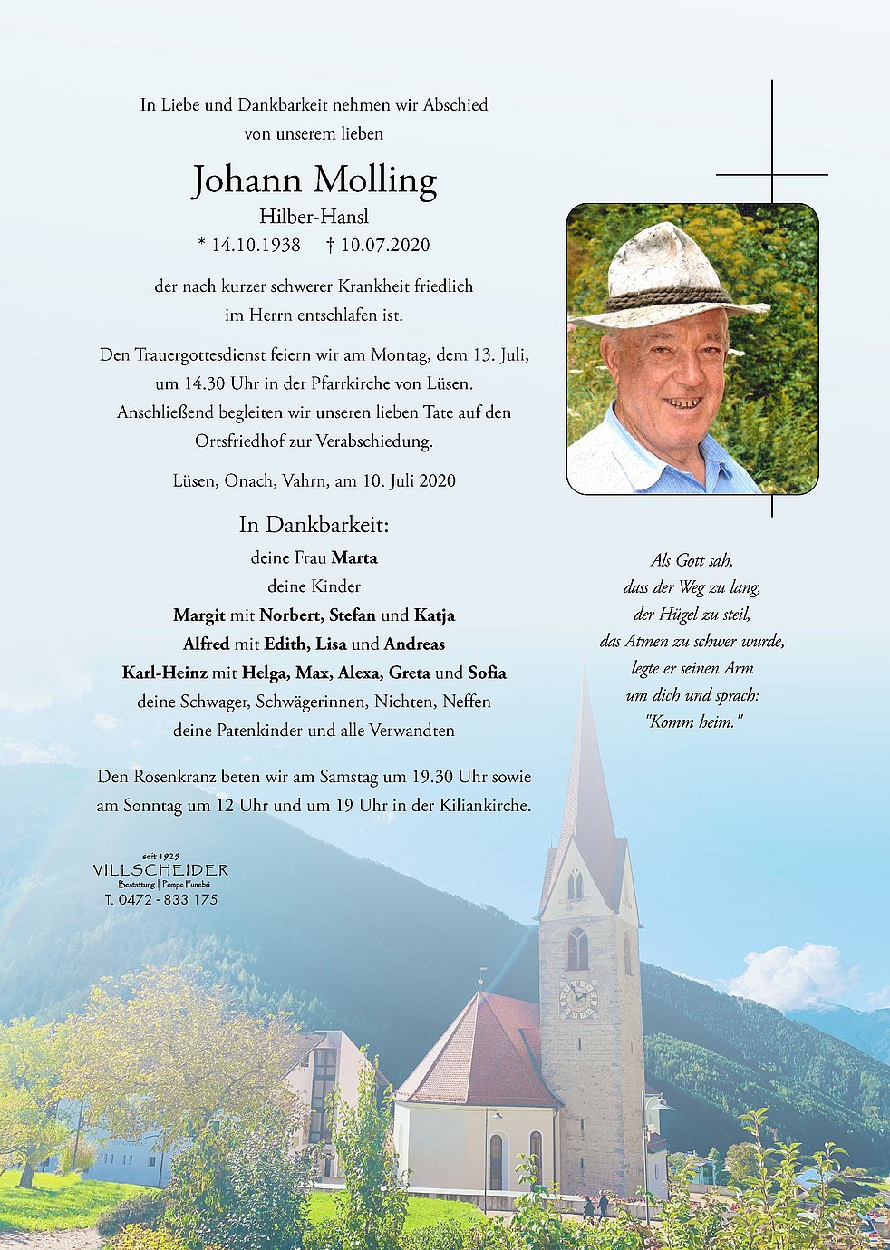 Trauerfeier: 13.07. - 14:30 Uhr Lüsen