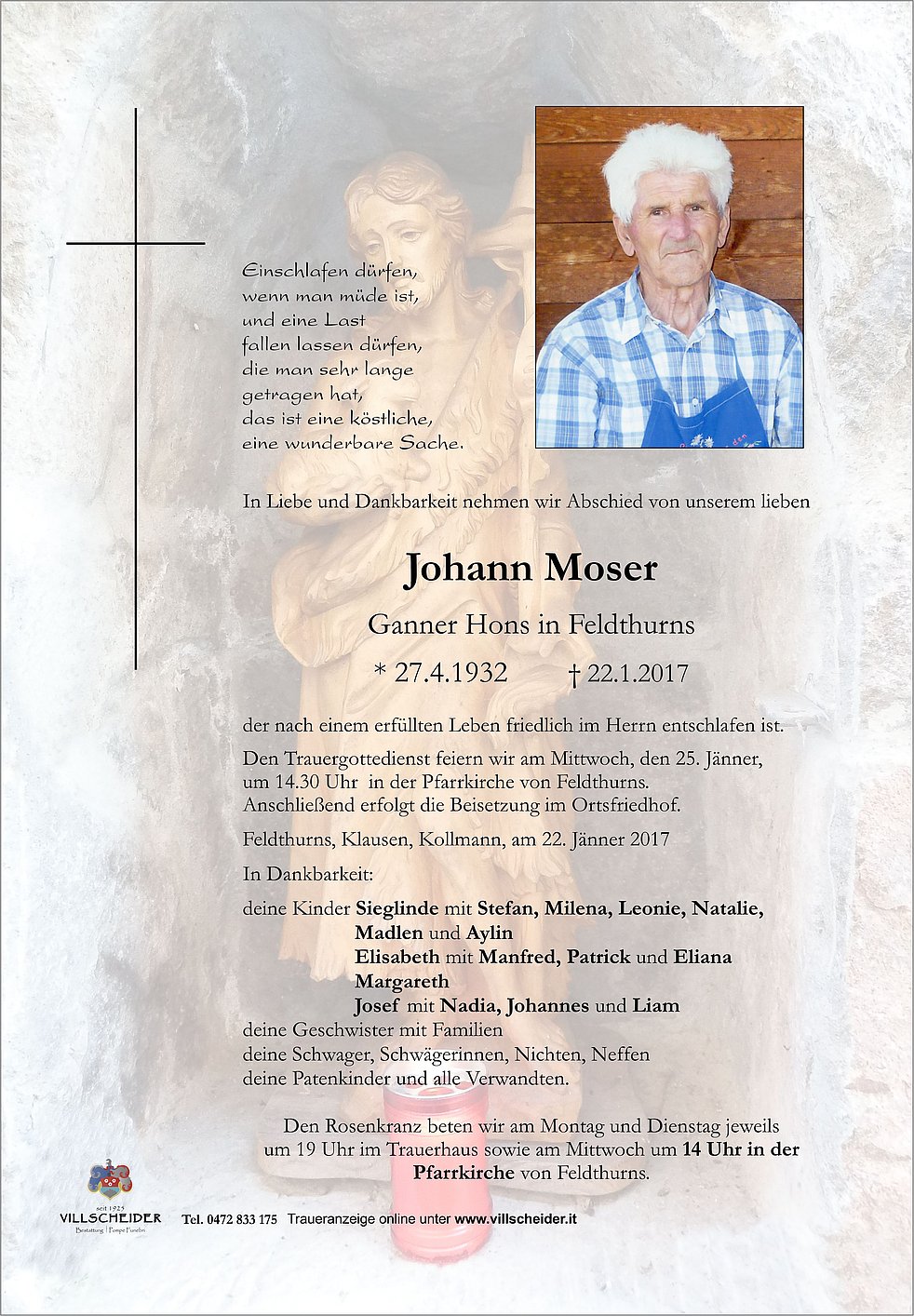 um 19 Uhr im Trauerhaus sowie am Mittwoch um 14 Uhr in der Pfarrkirche von Feldthurns.