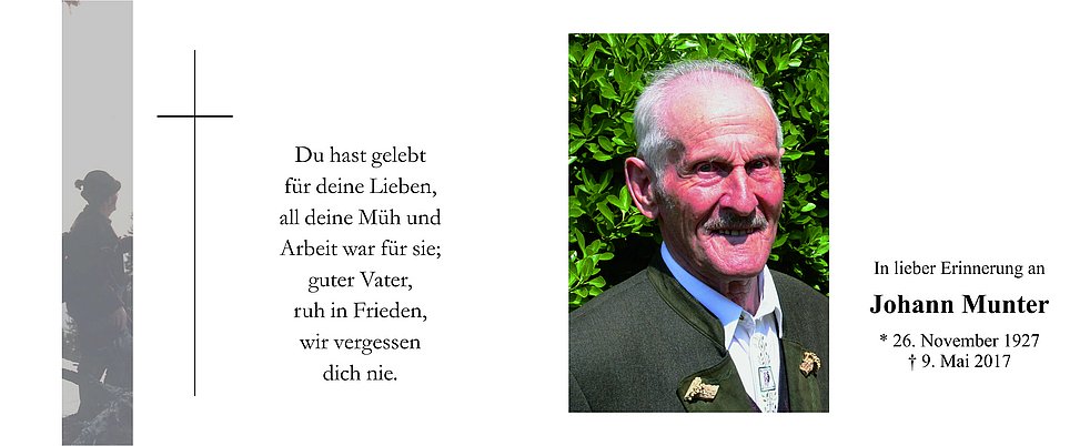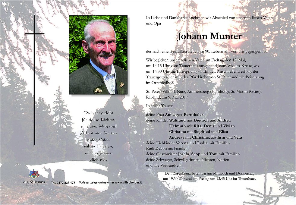 Wir begleiten unseren lieben Vater am Freitag, den 12. Mai, um 14.15 Uhr vom Trauerhaus ausgehend, zum Widum-Kreuz, wo um 14.30 Uhr die Einsegnung stattfindet. Anschließend erfolgt der Trauergottesdienst in der Pfarrkirche von St. Peter und die Beisetzung im Ortsfriedhof.