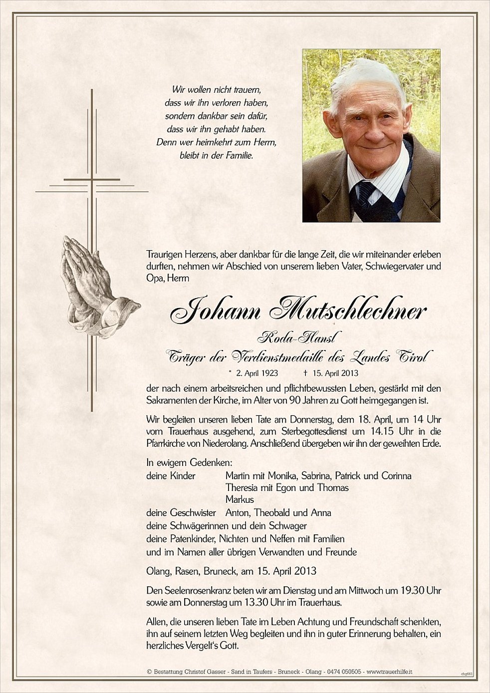 Wir begleiten unseren lieben Tate am Donnerstag, dem 18. April, um 14 Uhr vom Trauerhaus ausgehend, zum Sterbegottesdienst um 14.15 Uhr in die Pfarrkirche von Niederolang. Anschließend übergeben wir ihn der geweihten Erde.