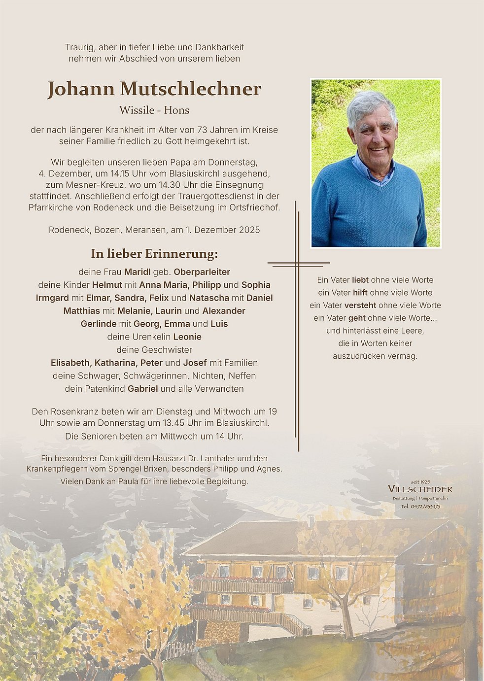 Begräbnisgottesdienst: 04.12. - 14:30 Uhr Rodeneck