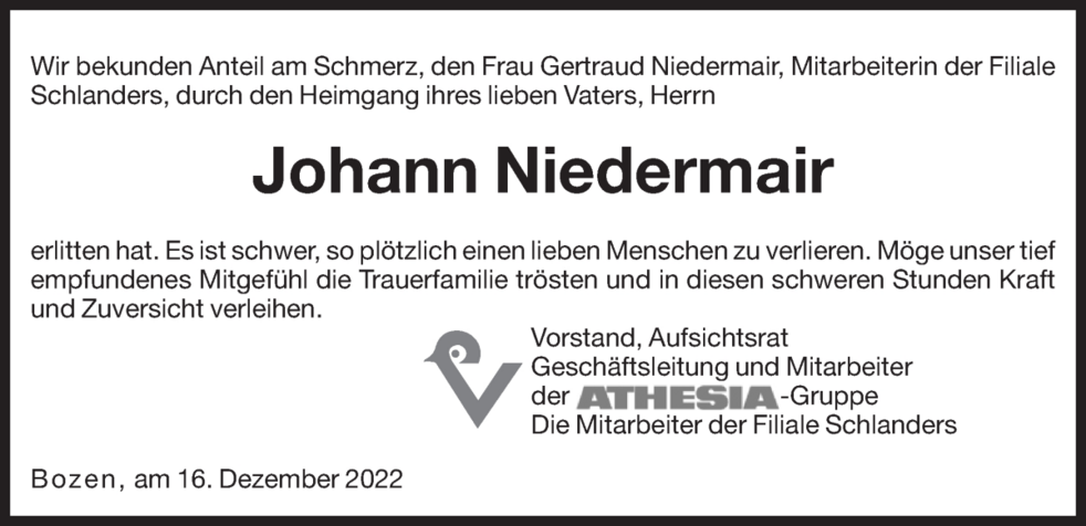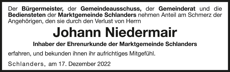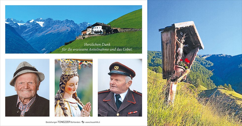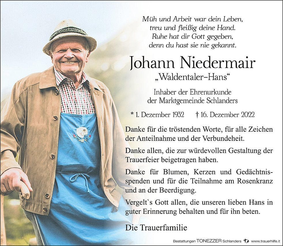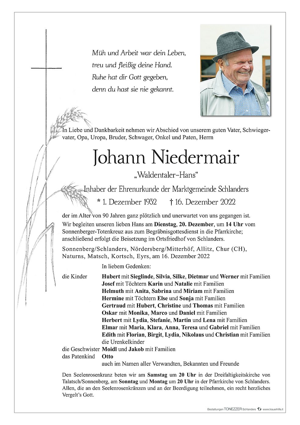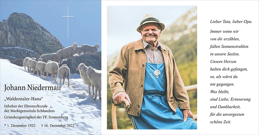 Wir begleiten unseren lieben Hans am Dienstag, 20. Dezember, um 14 Uhr vom Sonnenberger-Totenkreuz aus zum Begräbnisgottesdienst in die Pfarrkirche; anschließend erfolgt die Beisetzung im Ortsfriedhof von Schlanders.